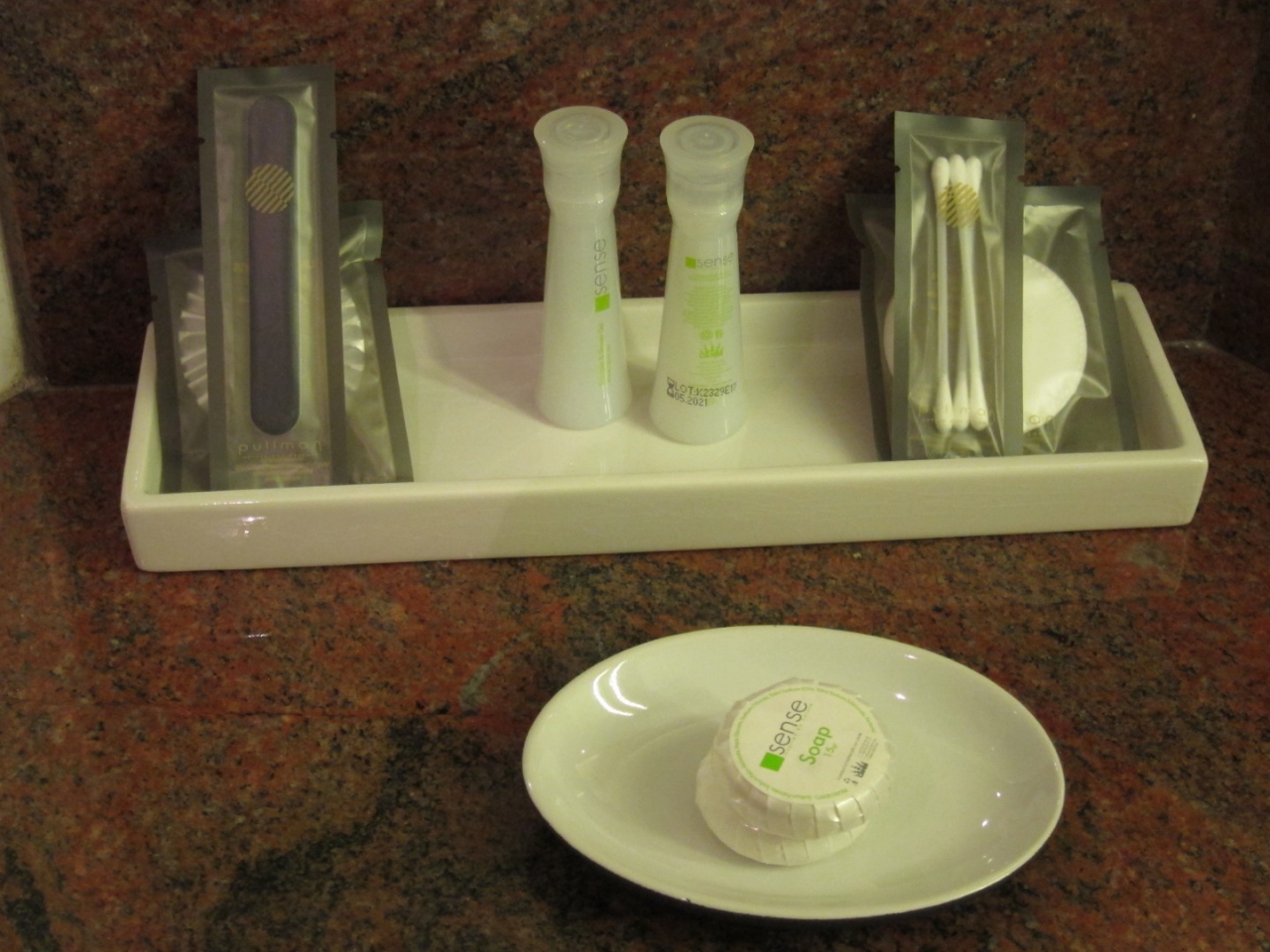 パックツアーで利用しました。初日と3日目の宿泊で、11階の同じタイプの部屋でしたがアメニティーなどが微妙に異なっていました。スリッパは初日のみあり、バスローブ及び無料の水ボトルが付いていました。WIFIは無料。