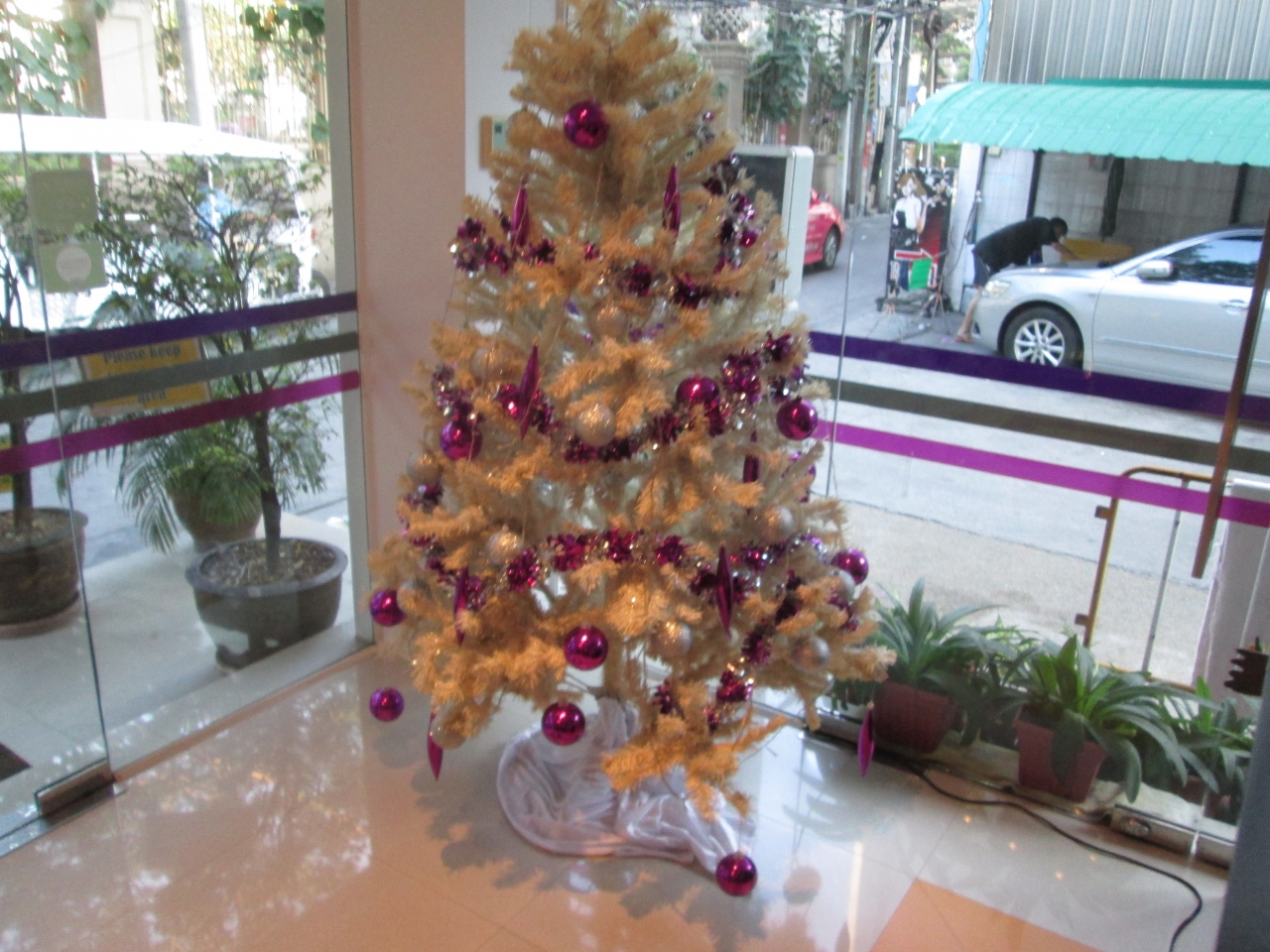 クリスマスの時期にパラディソ ブティック スイーツに滞在しました。エントランス付近には珍しいシルバーのクリスマスツリーがあり、きれいなツリーだったので記念撮影をしてみました。夜は1階共有部分のバーの店員はサンタ帽をかぶり、接客を行っていました。仏教の国なのですが、タイでもクリスマスは特別なイベントのようです。