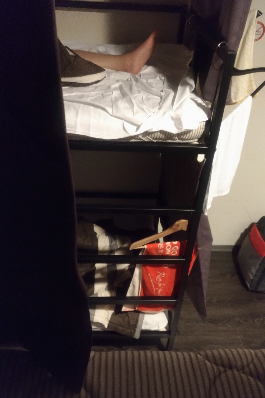 上段ベッドに登ったら・・・なんと枕とシーツ、布団がない。どうやらロッカーに入っているようです。また降りて音立てるのも迷惑だし・・・そのまま寝ました。(寒かった!笑)