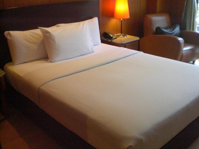 客室のベッドです。調度品も落ち着いた感じで、気が休まります。