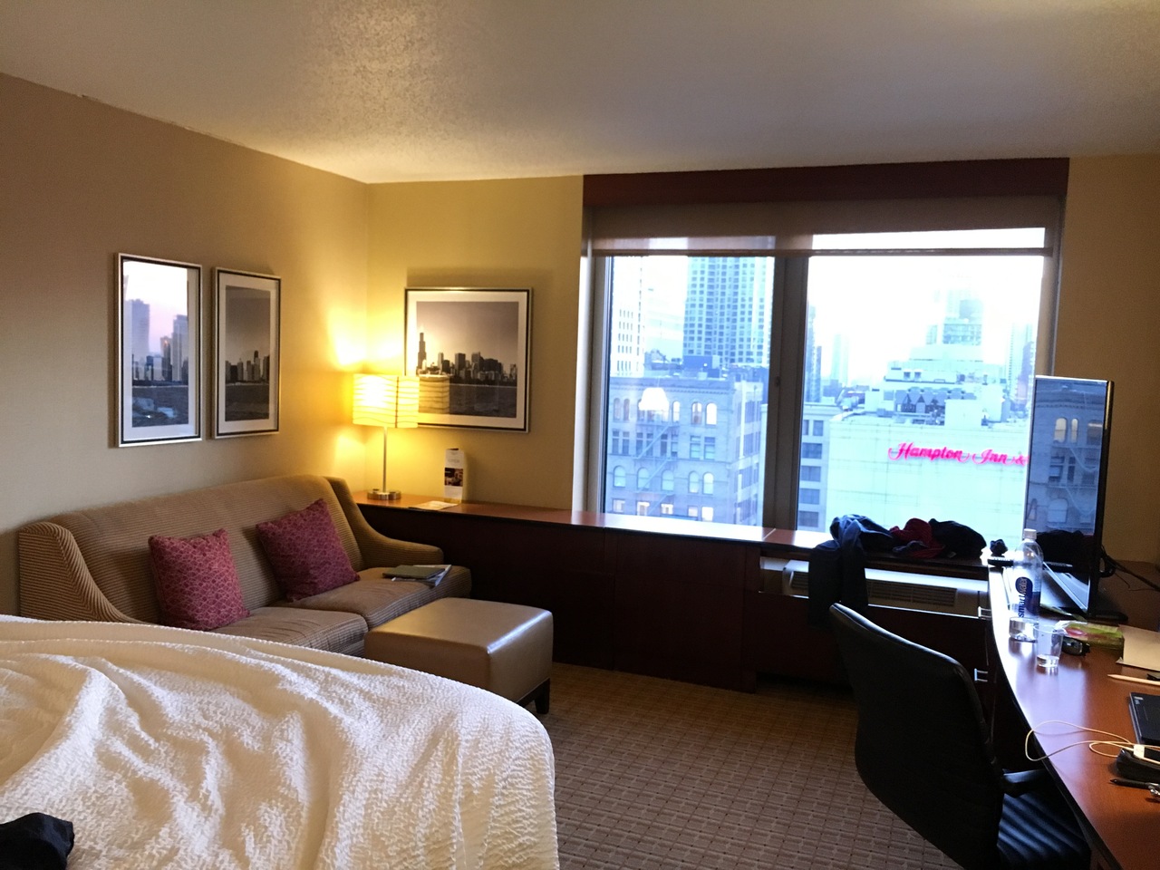マグニフィセントマイル沿いのマリオットと比較すると豪華さや新しさでは遥かに劣るものの価格が良かったのでこちらを選択しました。部屋も広くてソファもあり、寛げます。