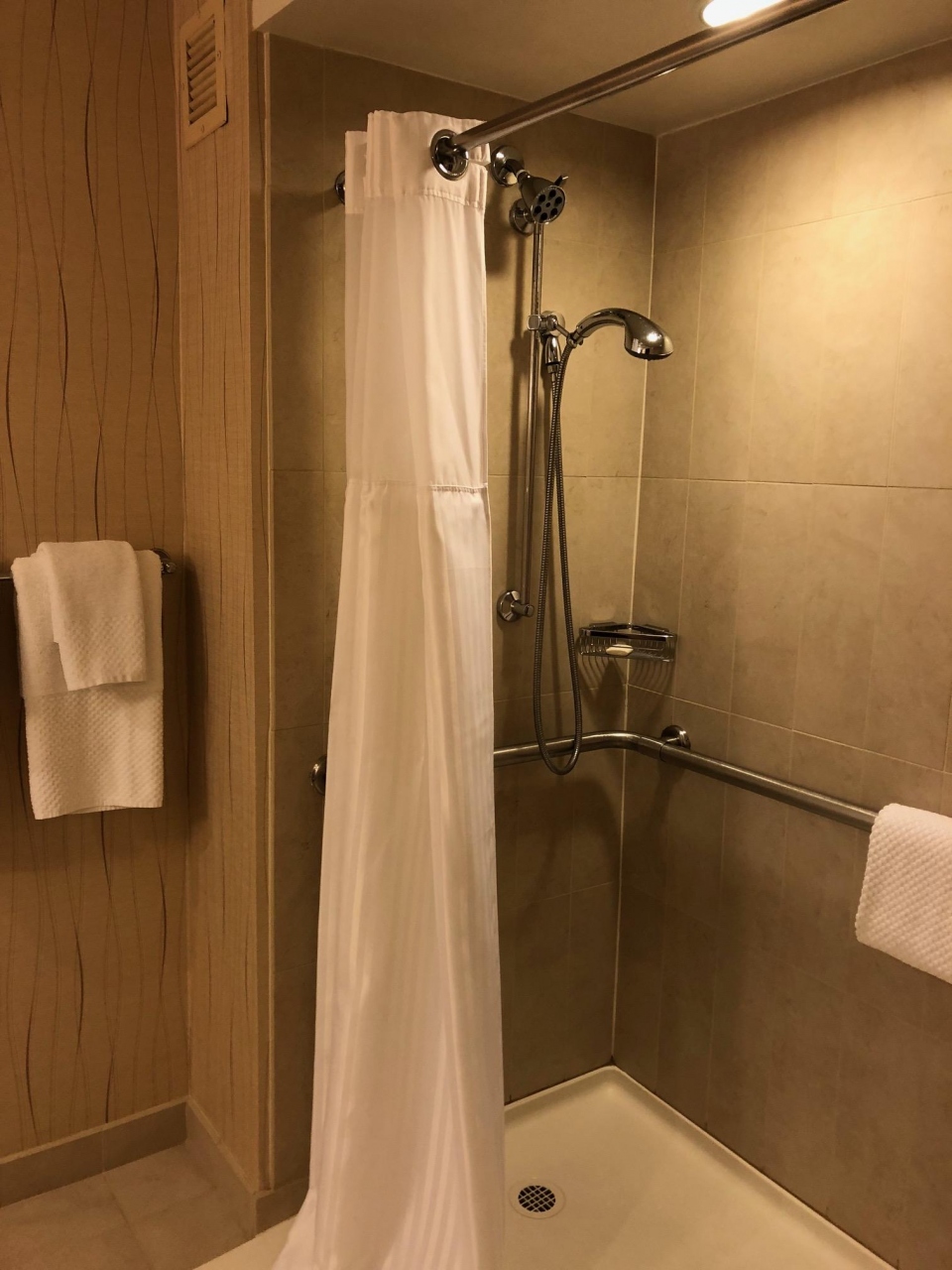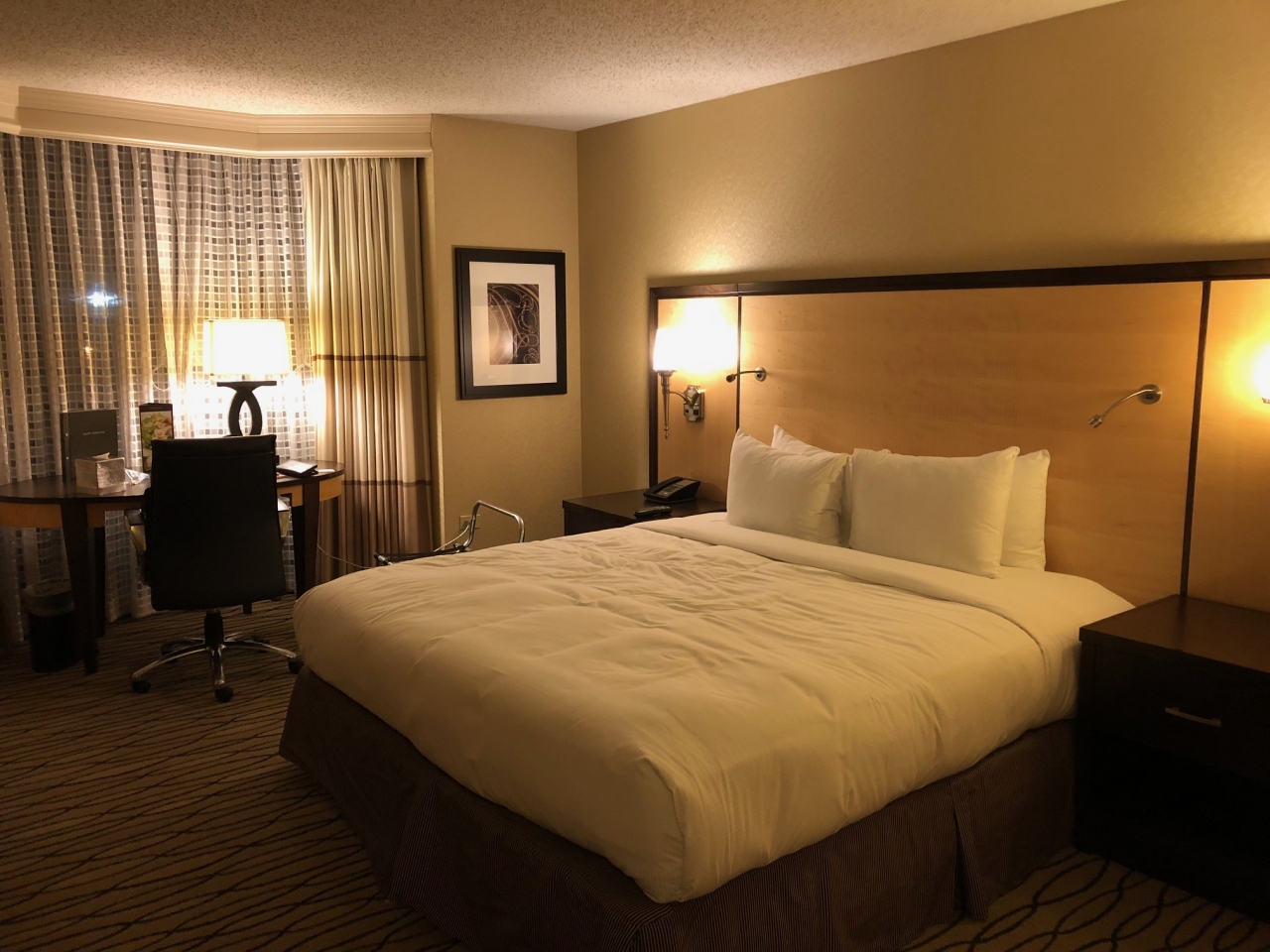 空港直結のホテルが取れなかった為、こちらを予約。シャトルバスで空港から15分ほど。ホテルの周りにはなにもなく、レストランもなく、結構不便。部屋はハンディキャップ用があてられた為、バスルームは広かった。朝食はついていなく、別料金。