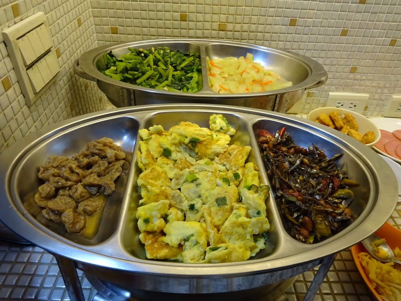 朝食は地下の暗めの食堂で食べます。3泊しましたがメニューは何一つ変わらず安定のリオメニューでした(笑)お粥があったし、朝は少しで構わない私たちにとっては無料でいただけたのは良かったです。