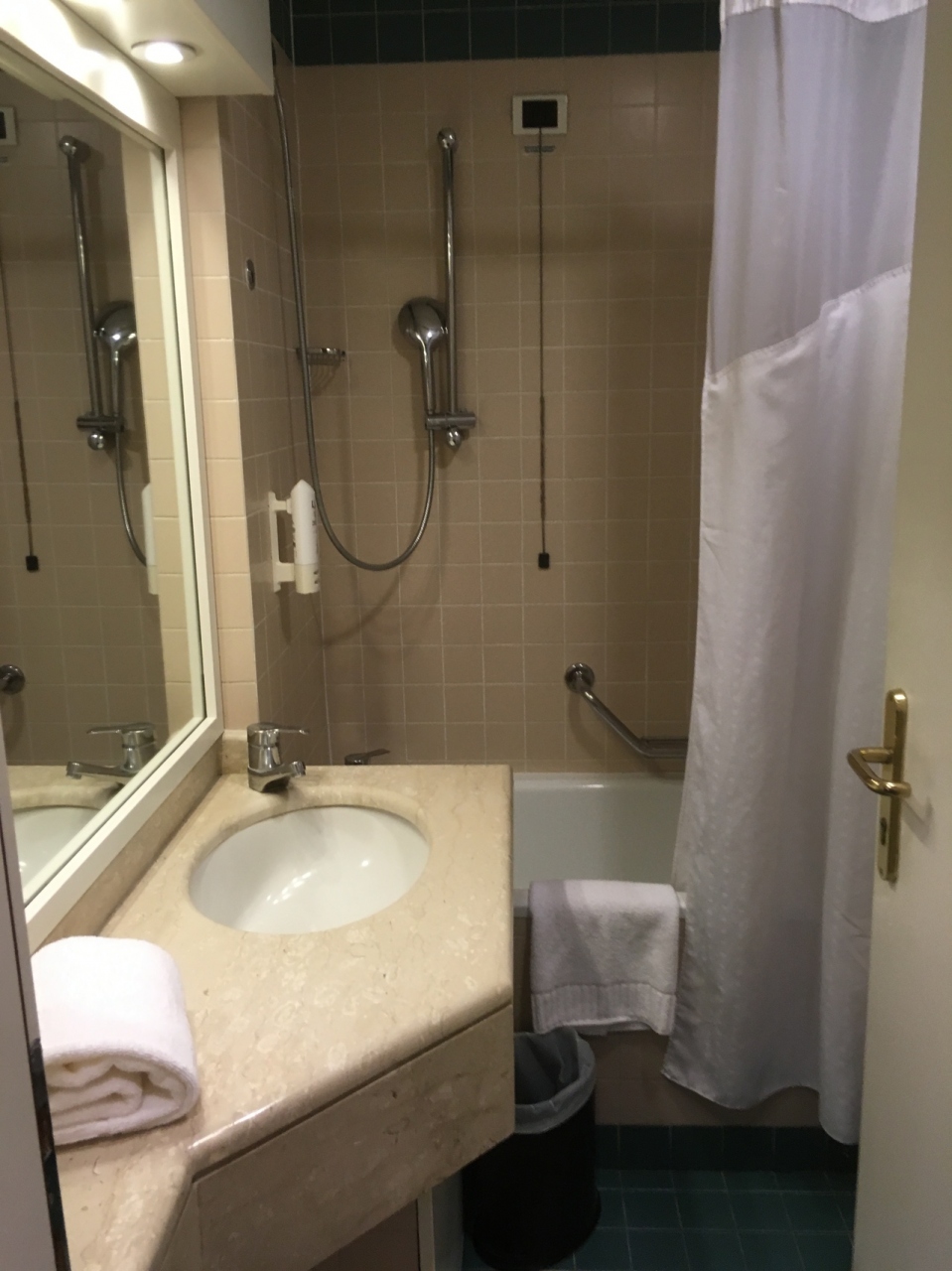 325 室ある高層ビルの4 つ星ホテルです。部屋もバスルームも清潔でした。鍵はカードキーで、主電源タイプなので部屋に入ってボックスにカードを差し込むと電気が付きます。エレベーターは4基ありますが制御が悪くて、かなり待たされます。朝の朝食時間帯と出発時間帯が重なるとエレベーター渋滞が発生します。エレベーターに乗るのに15分も待たされることも。金庫、冷蔵庫、ミニバー、ドライヤー、バスタブが完備されていました。部屋から部屋への通話は、部屋番号のみで繋がります。外線は0発信です。フロントの内線は99番です。フロント(レセプション)があるのが-2階です。グループの場合は入場時間と会場、テーブルが指定されます。朝食、夕食会場は0階か1階のレストランを指定されます。バーも0階です。0階から出て15分程のところにスーパーがあるらしいですが、周辺は倉庫のような廃墟のような建物が立ち並び、出ていこうという気にはなりませんでした。20時くらいまでなら、0階から出たあたりに多少、ショップがあり、ドリンク、スナックなどの調達も可能です。WiFiは無料で、パスワードはフロントに言えば教えてくれます。窓は開かないタイプです。21チャンネルでNHKワールドが流れていました。3階と4階のエレベーター近くに製氷機がありました。チェックイン時に宿泊税が必要です。
