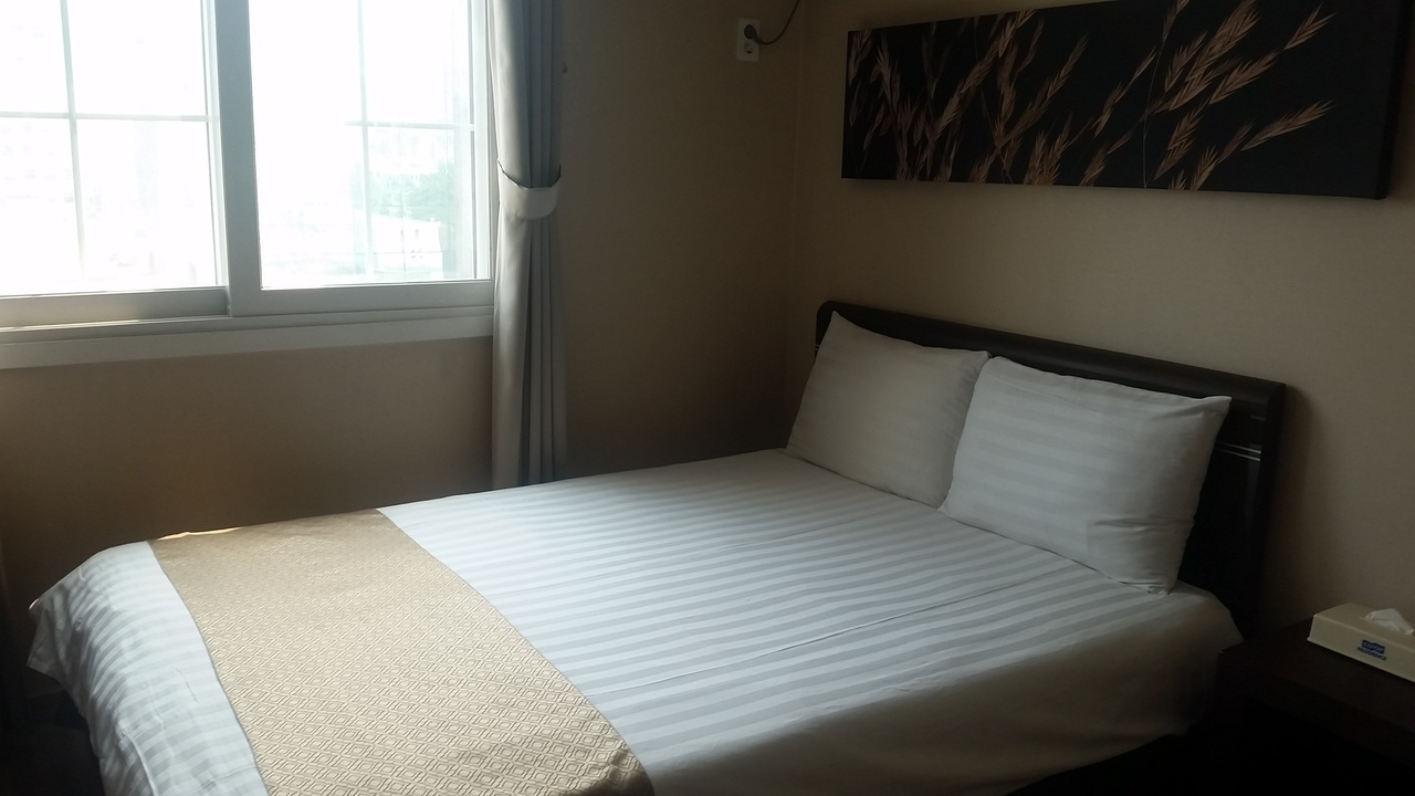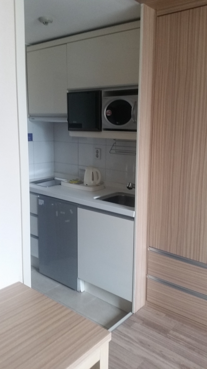 小さいキッキンあり、長期滞在も可能ですが、清掃が甘く、シーツのシミやテレビのリモコンが汚れていたり、エアコンの上がホコリだらけで立地以外にあまり良い印象はありませんでした。東大門から近く、空港バスも目の前で止まるので、寝るだけなら我慢できる範囲です。