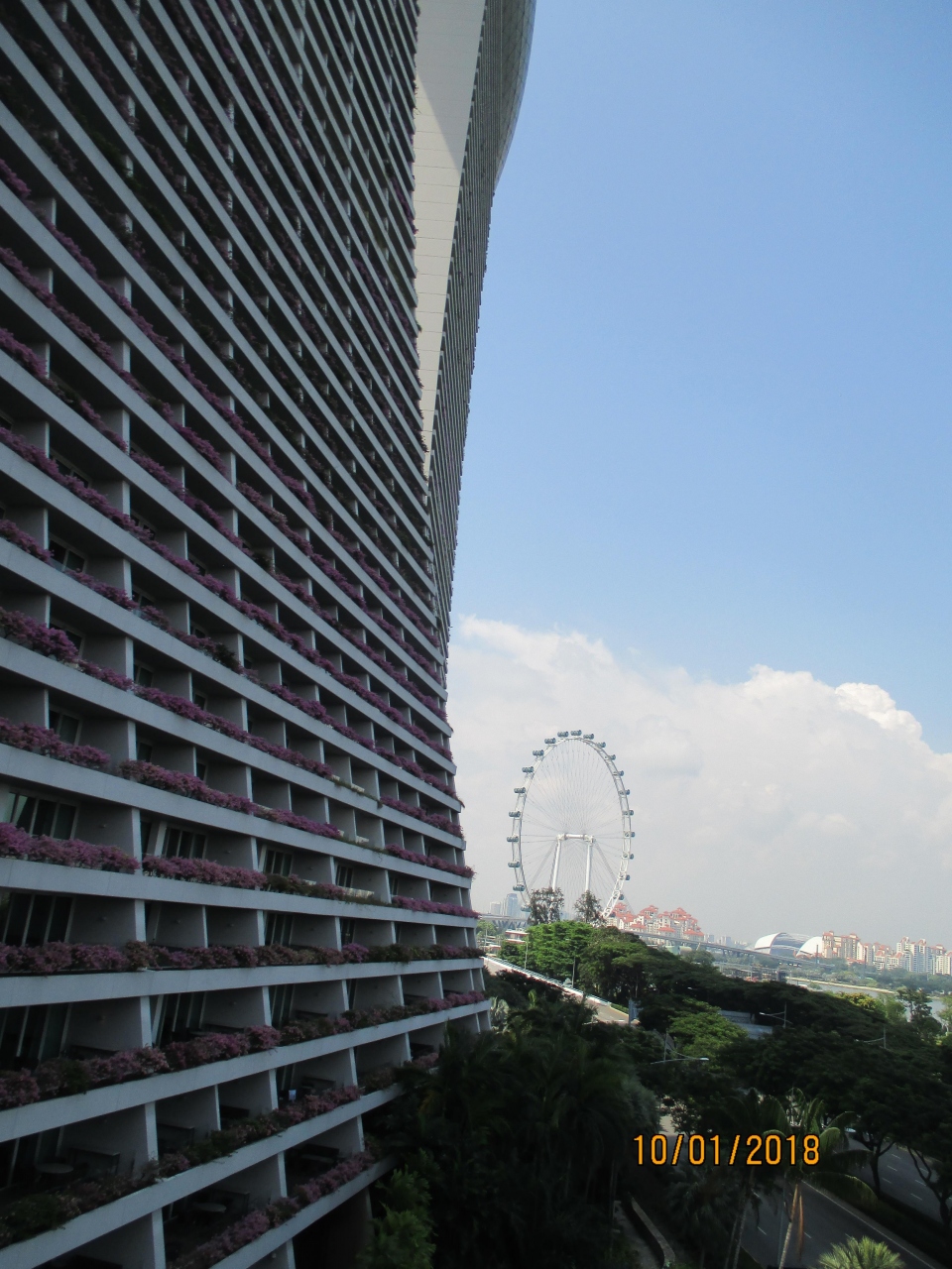 連絡橋(「ドラゴンフライ・ブリッジ」というそうです)からは、マリーナ湾を挟んで向こうにあるシンガポール・フライヤーや、ガーデンズ・バイ・ザ・ベイの沖に広がるシンガポール海峡に停泊するクルーズ船も見えました。
