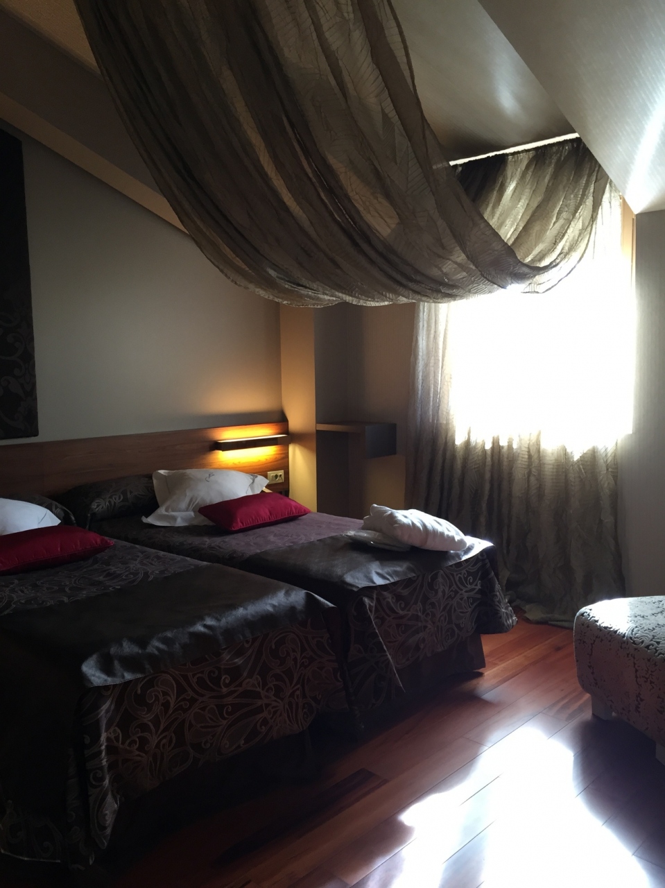 建物の外観は石造りで重厚、中に入るとモダンな印象で、敷地からはペニャフィエル城が見えます。