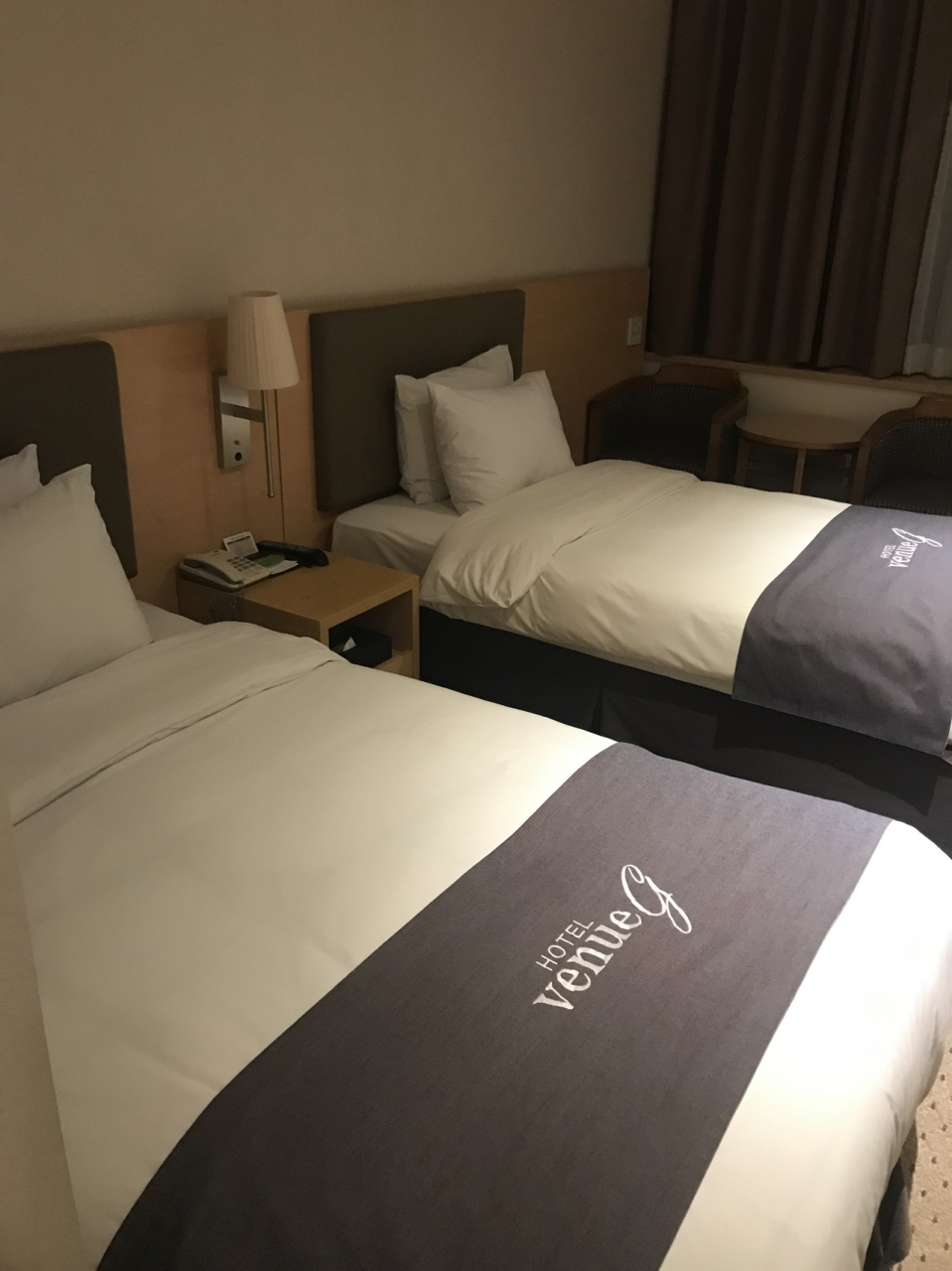 ソウルにあるホテルアベニューGです。フロントは少しだけなら日本語も通じました。駅からもすぐ近くにあります。ホテルもまだ新しい方なので部屋も綺麗でした。ツインの部屋には無料のペットボトルが2本ありました。