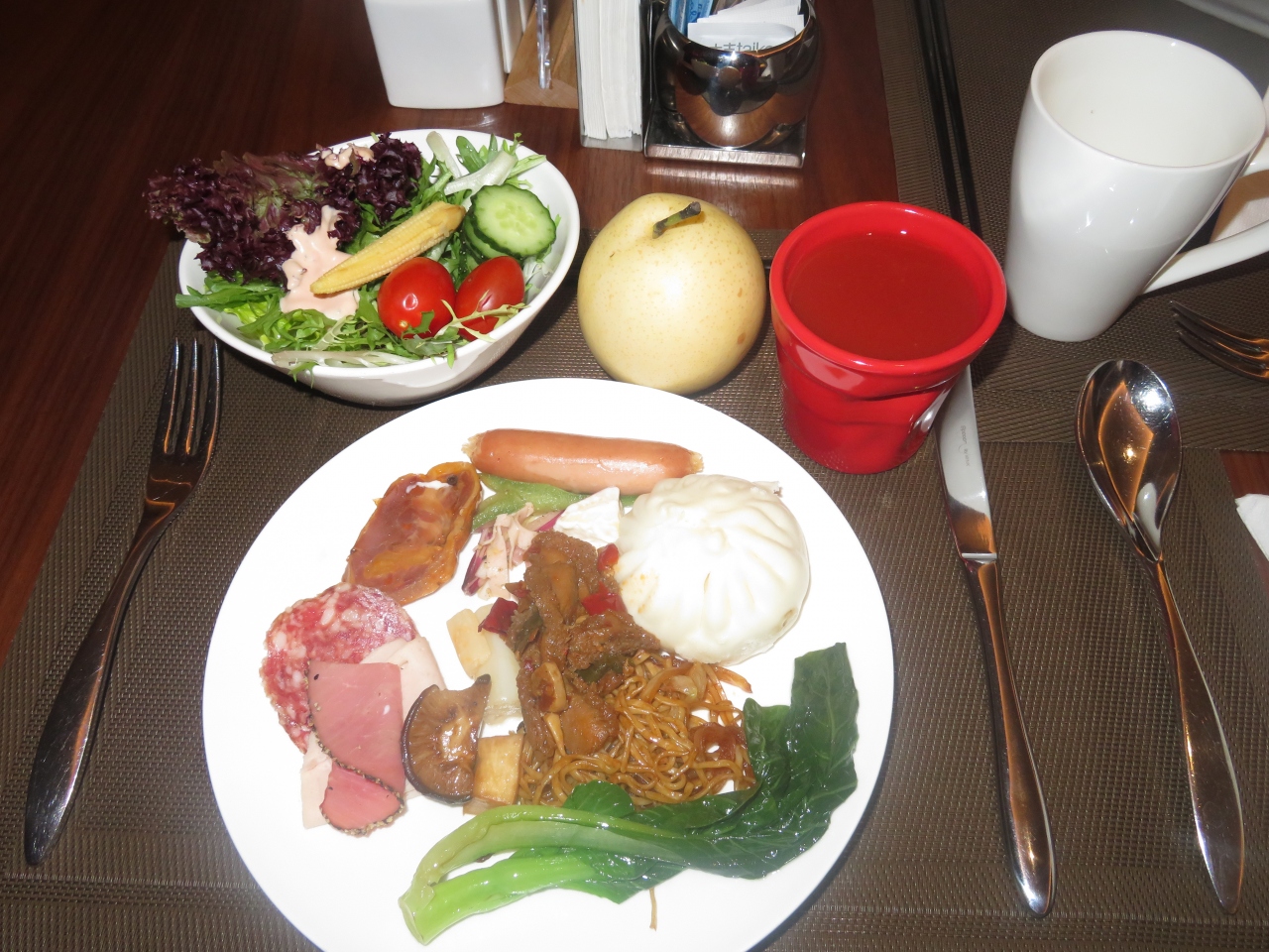 マリオットプラチナなので、5階レストランか22階ラウンジで朝食ビッフェをいただけました。私は5階レストランで朝食を取りましたが、コックさんが中華風卵ワッフルを作ってくれます。あんまん等蒸し物や麺もあり、中華料理も数多くありました。
