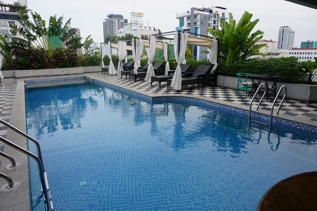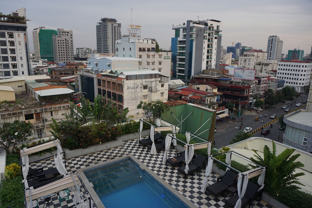 プノンペンの街中にあるホテル。外観はあまり綺麗ではないですが、内装はとっても綺麗でした。部屋も水回りも綺麗に清掃されていました。上階にプールがあり、プノンペンの雑踏を聞きながら、楽しむ事が出来ます。プノンペン市内は地下鉄もなく、バスはほんの限られた路線なので、街中であればどこに宿泊しても一緒のような気がします。僕たちはツゥクツゥクを利用してホテルから動きました。