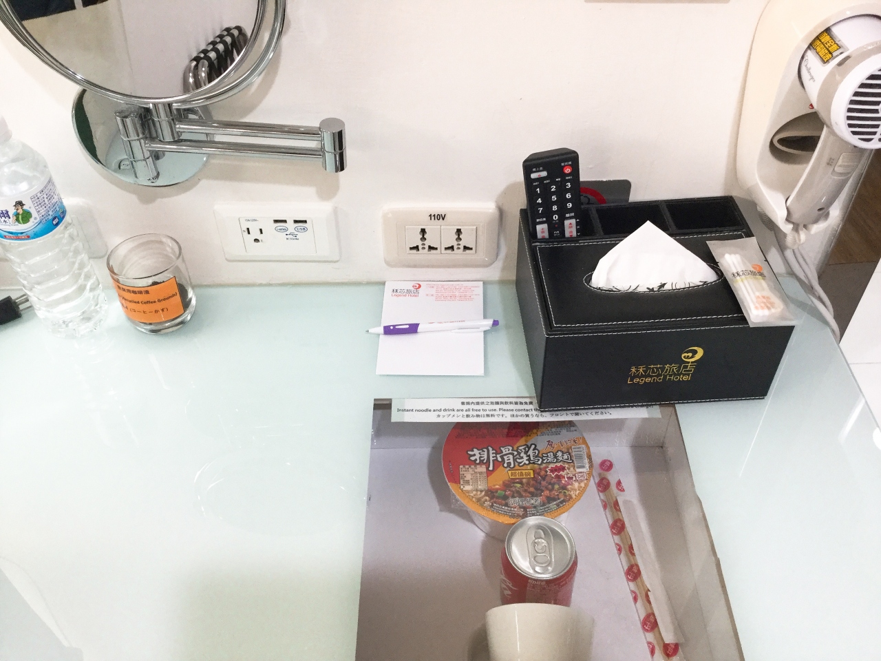 部屋には水、コーラ、カップ麺が無料のサービスとして用意されており、フロントにはコーヒーマシンがありました。