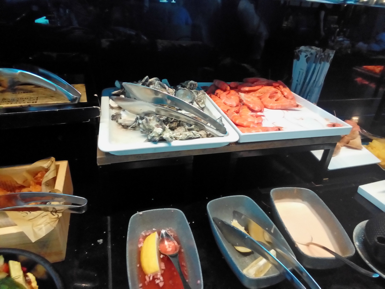 cocktail timeでは、中華系点心、巻きずしといなり寿司、そして生牡蠣とボイルエビが毎日提供されました。エビとカキは人気で、どんどんなくなりますが、途切れることなく追加が運ばれてきます。3泊全てでエビとカキが提供されて、かなりの量を食べることとなりました。