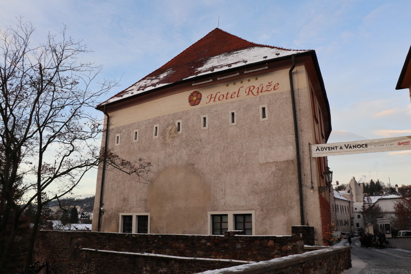 旧市街地地区の外れにあります。歴史のありそうな建物でこじんまりとしています。ホテルの前の広場からチェスキークルムロフの代表的な写真が撮れます。部屋は広いですが、長年使っているのだろなという感じです。2泊しましたが2日目の夜から朝にかけて、冷たくはないのですがお湯の温度が上がらない状態でした。