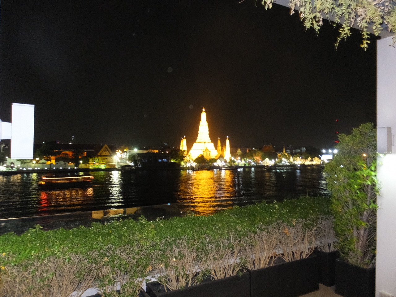 部屋は両側ともコネクテッドルームになるよう扉がある。両側とも空き部屋だったが,音漏れは大丈夫だろうか。何と言っても特徴は対岸のワットアルンの美しい眺望。10畳程度のバルコニーにはソファ等と大人二人がゆったり入れるジャグジーがある。ジャグジーにはハンドシャワーもあり,バスタブとして使える。隣室のバルコニーとは全面が鏡で仕切られている。ただし,うるさい観光船や船のエンジン音にもさらされる。また,蚊にも刺された。