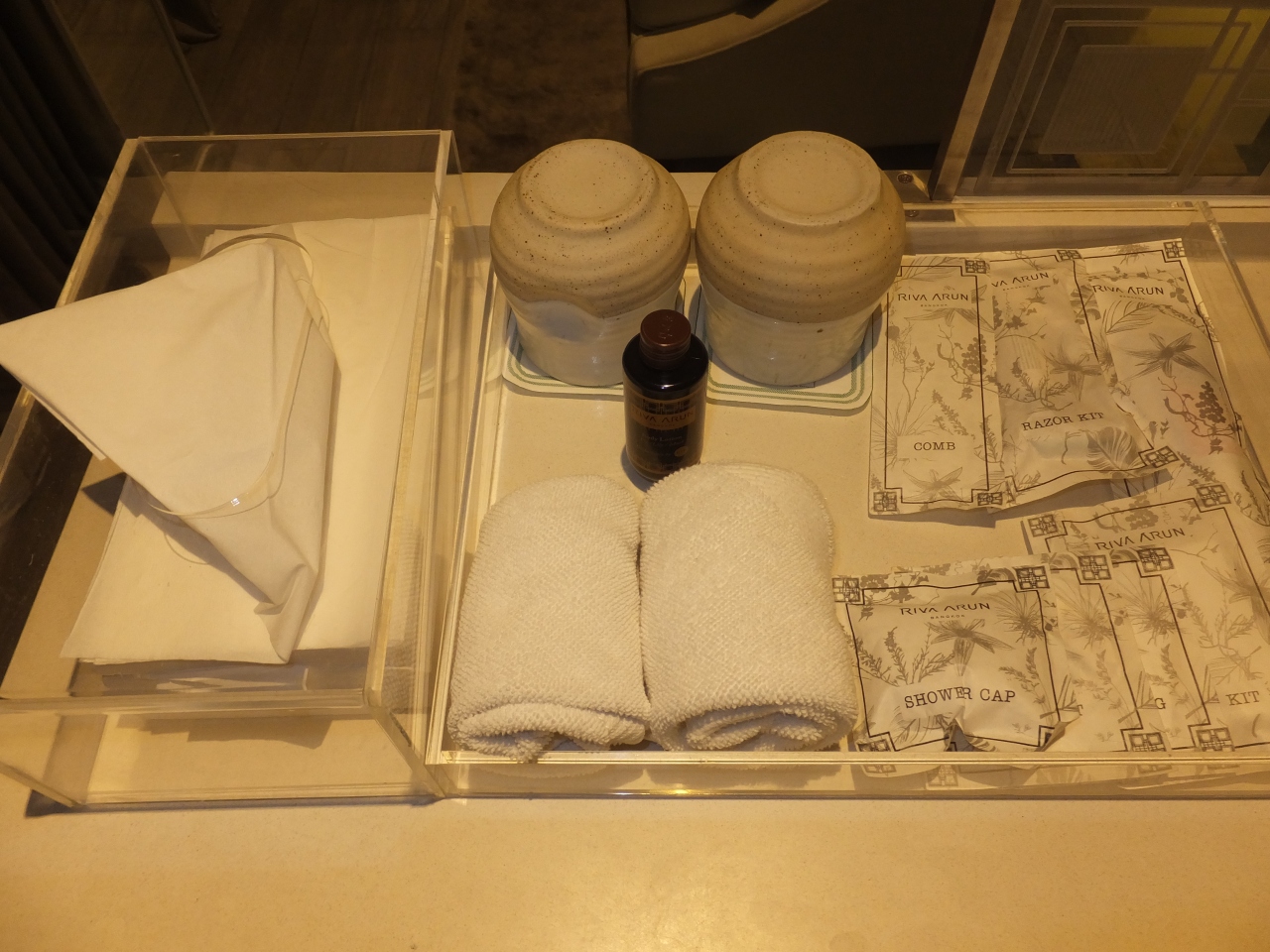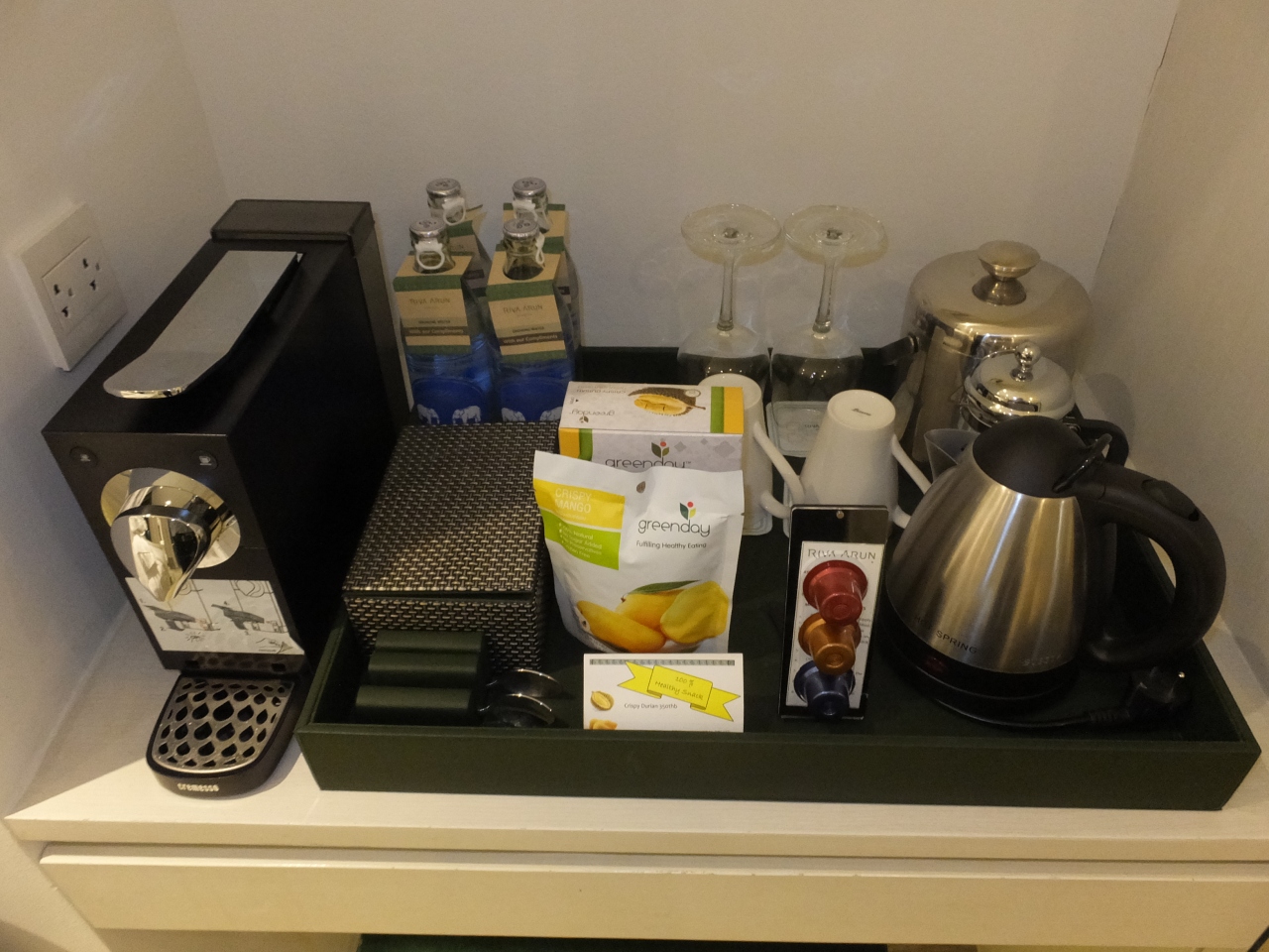 室内はキングサイズベッドとアイランド式洗面台でいっぱいである。欧米式でベッドや便器の位置が高い。トイレとシャワーブースは鍵がかからないリゾート仕様。ネスプレッソのカプセル式コーヒーも無料。水は4本。アメニティーは靴べら以外全てある。清掃は行き届いている。テレビに日本語放送はなかった(映らないチャンネルがあったので,本来はそこがNHKワールドだったのかも)。書道系の絵画が多く飾られているので,中国的雰囲気もある。