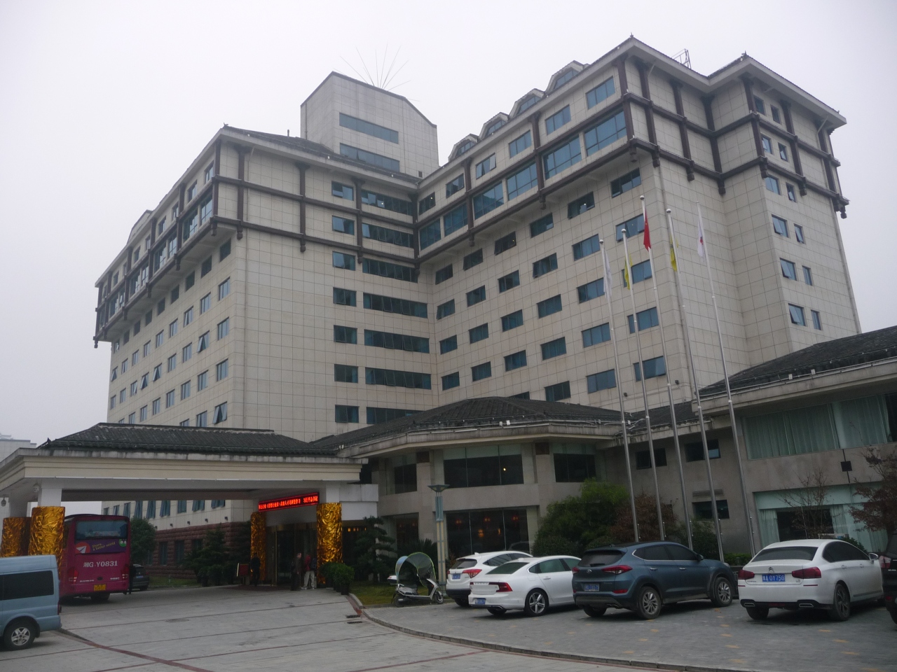 「張家界国際大酒店」という。川のほとりの丘の上に建つ10F建の大型ホテル。外観デザインが良く写真写りも良いが、建物自体は古い。車寄せ・玄関・フロントなど1Fのエントランス部分が建物本体から突き出した形になっている。丘の上でゆったりした広さがあるので、小規模の庭園もある。