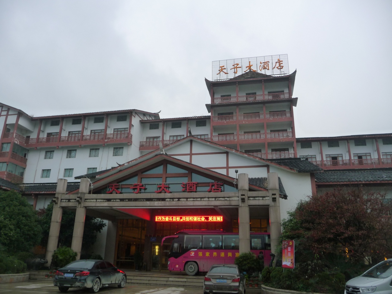 武陵源市のほぼ中心部に位置する主にツアー客向けの5F建ホテル。一見鉄筋造りでないような、木造木組みの感じがするホテル。大通りに面し、ゆったりした敷地に駐車スペースを設けた奥に、建物が建つ。建物は古い。