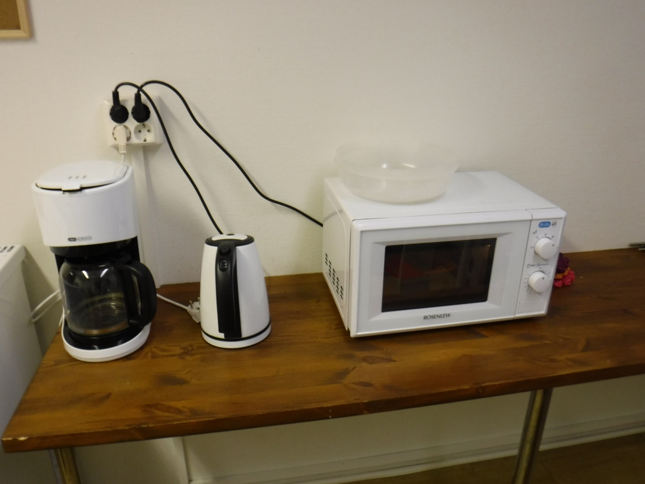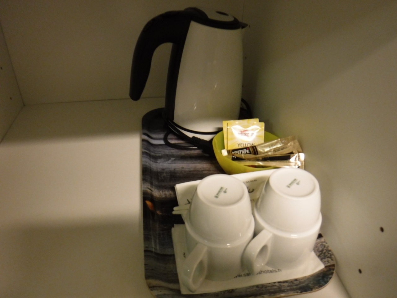ホテルの地下にはキッチンと小さなダイニングテーブルがあり、ポットや電子レンジも使えます。先ほどのマクドナルドの向かいにはスーパーがあるので、そこで食材を買い込んで食べると滞在費も抑えられて良いです。