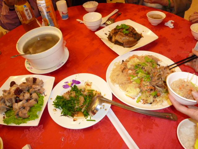 魚料理、スープ、肉料理、ビーフン、青菜料理、肉料理数種など