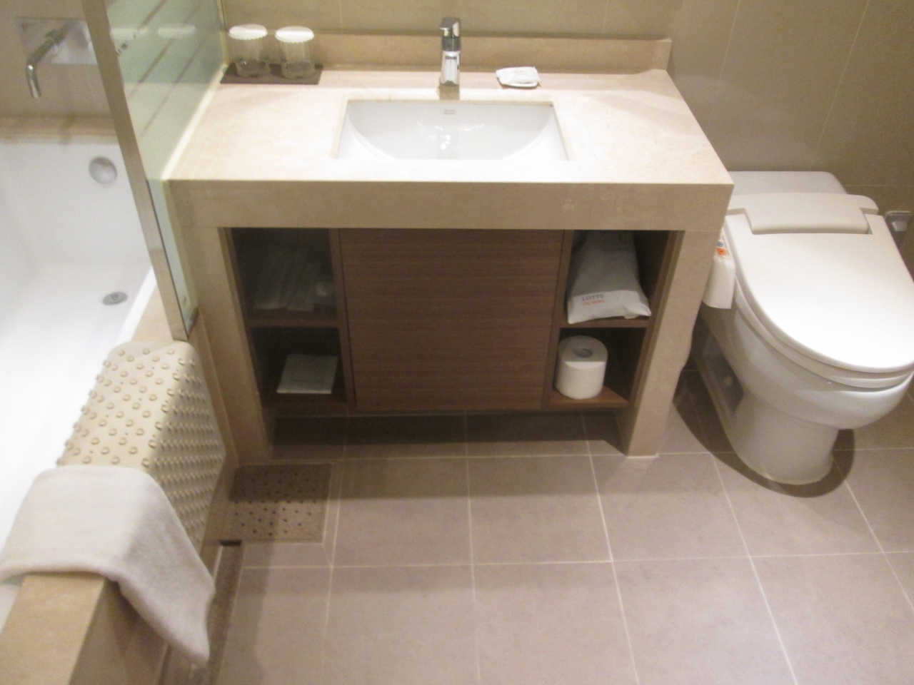 トイレルームは広くバスタブが付いていました。アメニティーのシャンプー、シャワージェルは使い切りや少ない場合がありますが、こちらのホテルは残量を気にすることなく利用できました。トイレにはウォシュレットが付いており、快適に利用できました。
