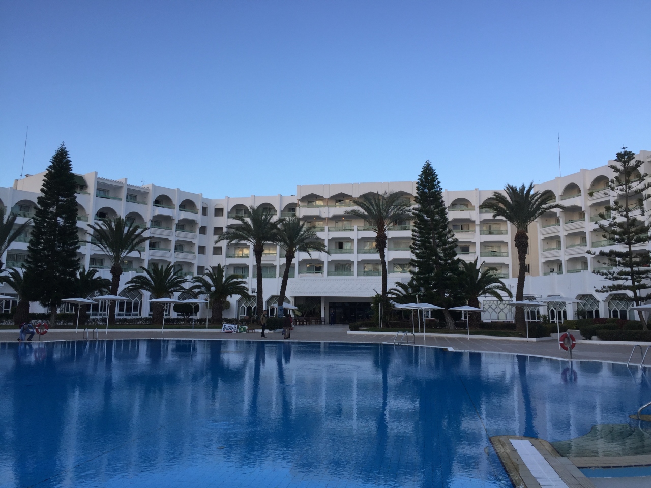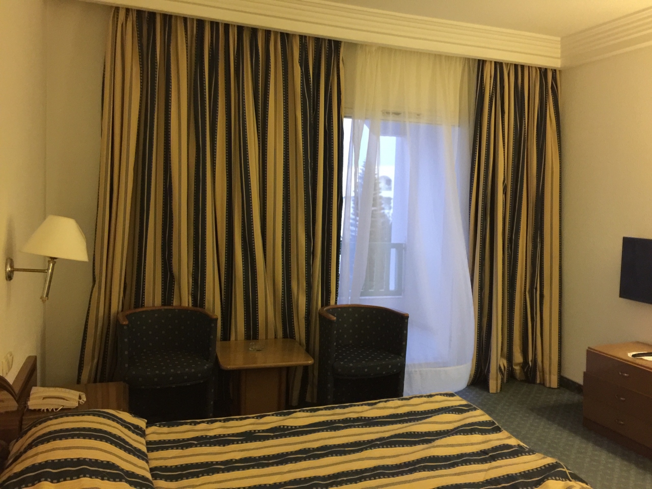 ツアー初日に利用しました、リーゾートホテルで大きなプールとプライベートビーチが有ります、ぱっと見は小奇麗なホテルですが随所に古さが目立ちます、季節柄部屋には暖房が入っていたのですが、暑くて暖房を切ってもバスルーム前の廊下部分は個別になっていない様で、仕方が無いので窓を開けて寝ました、バスタブ付きですが栓(蓋式ではなくバスタブの給湯カランの下についているまあるいのを回すタイプ)回しても壊れていて閉まりませんでした、おゆはたっぷりと出ましたので問題なしです、大きめなベランダに椅子とテーブル有り、眺望もプールと先に地中海が見えました、