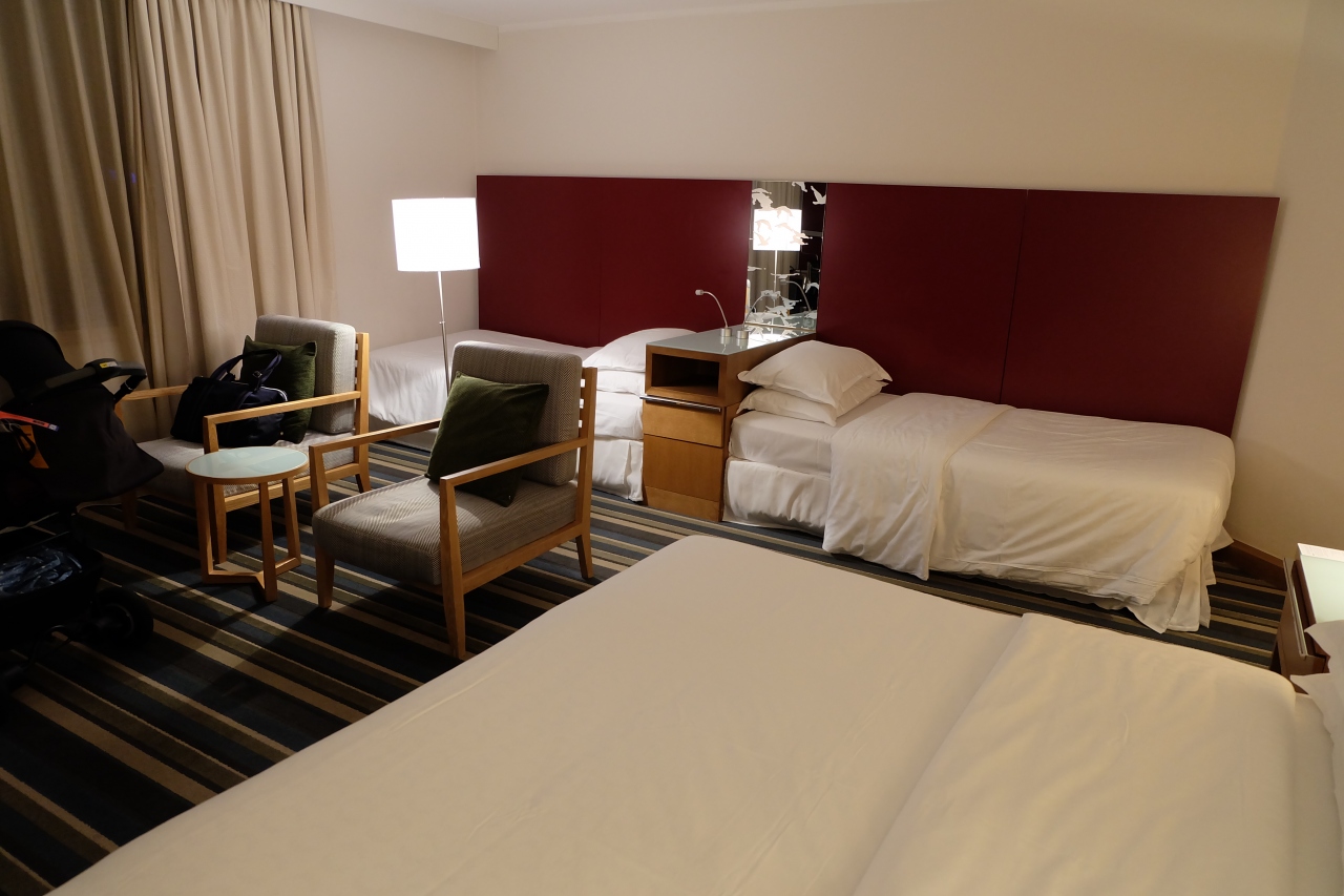空港直結のホテルです。普段は地上の通路で空港から道路を渡ることができるのですが、私達が宿泊した時は工事中で渡ることができず、大回りをしました。地下通路はエレベーターがなかったのでベビーカーとスーツケースの移動はやや大変でした。