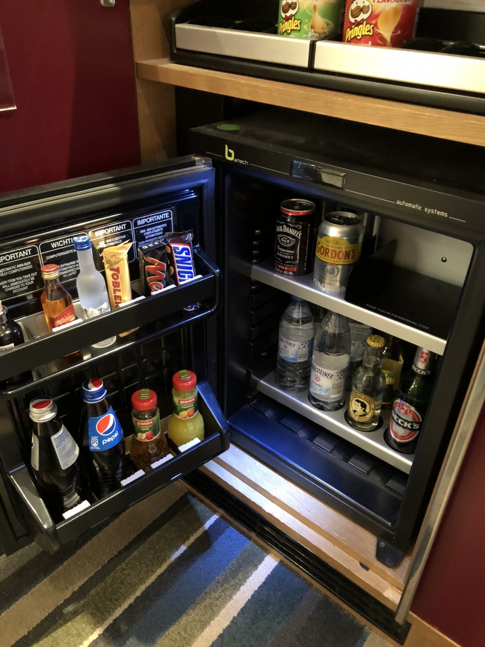 お部屋をアップグレードしてくれた様で、かなり広く大きなスーツケース2つも余裕で広げられました。冷蔵庫は通常ロックされているので、使用する場合はフロントへ連絡する必要があります。そして庫内のフリースペースは、ほんのわずかで(写真の上段の右側のみ)、私達は自動課金式のスペースも使用したかったので、セットしてあるドリンクを全て取り除いてもらいました。ただ自動課金のシステムをフロントで一旦リセットしなくてはならなく、これにかなり時間を要しました。