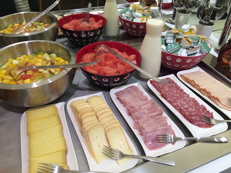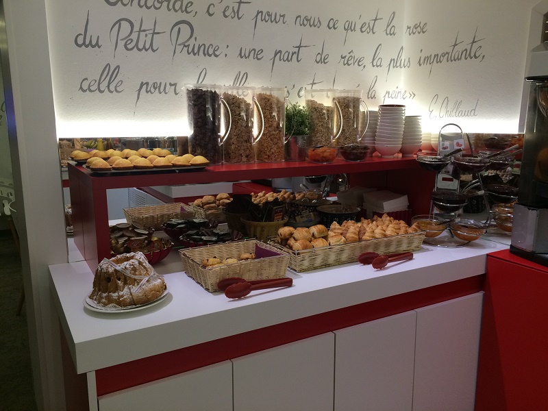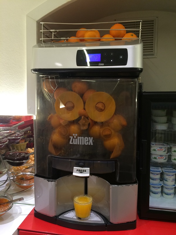 フランスのホテルでは珍しく宿泊者全員朝食込みでした。無料朝食の割に内容がかなり品数豊富で豪華に思いました。ヨーロッパのスーパーなどでよく見かけるオレンジの生絞りマシンまであり、朝からフレッシュオレンジジュースがいただけました。