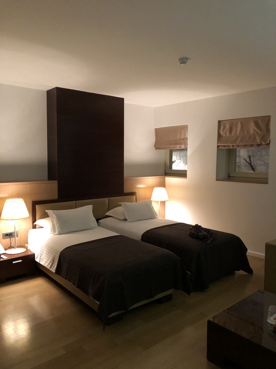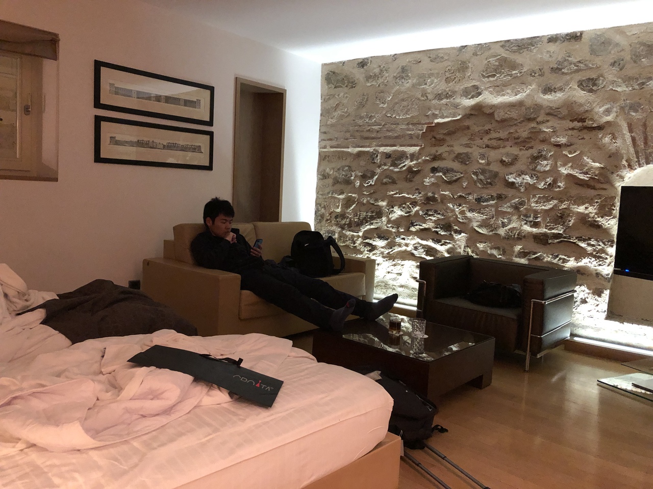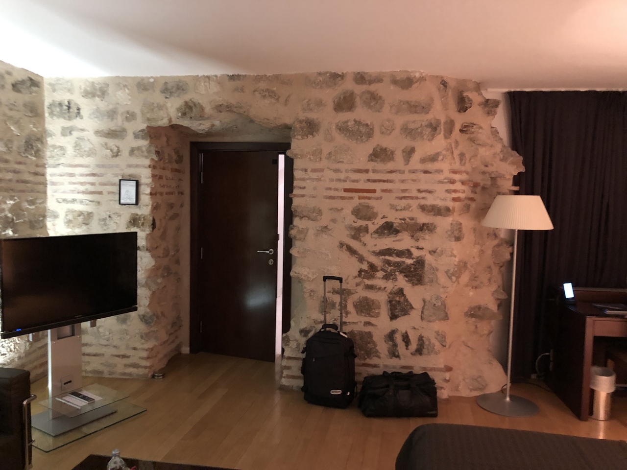 小さいけれど、歴史的な遺跡、ディオクレティアヌス宮殿内にあるホテルということで、少し高めでしたが、予約。午後ついて半日スプリット観光の拠点にしたかったのに、飛行機がキャンセルになり、バスで到着が遅れ夜8時前にやっと到着、早朝にチェックアウトしなければならなかったので、滞在が10時間足らずになってしまいました。それでも、このホテルで一晩すごせたのは、スプリットの街を味わうに十分でした。広くて、石の壁も、宮殿とマッチしており、空調はWi-Fi、シャワー室も近代的で使いやすかった。