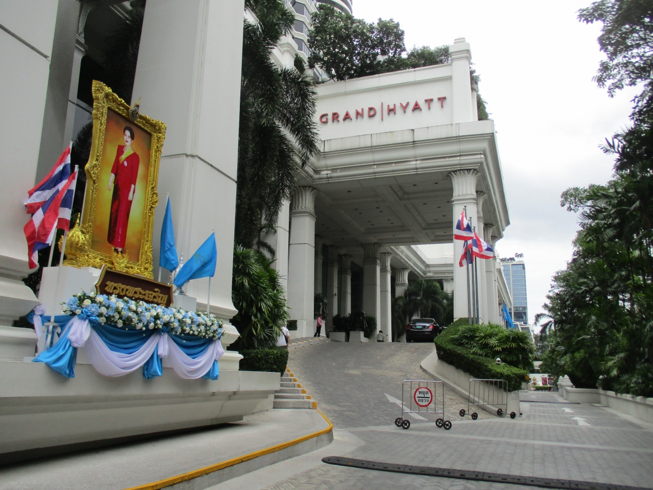 8月12日はクイーンシリキット王妃生誕記念日で、タイにおける「母の日」でもあります。グランド ハイアット エラワン バンコク ホテルのエントランスには王妃様の写真が飾られたり、イベントが開催されていました。記念日当日は客室のテレビでは全てのチャンネルで国を挙げて開催された式典の中継が放映されていました。少し異様な雰囲気でしたがタイの文化を肌で感じることができました。