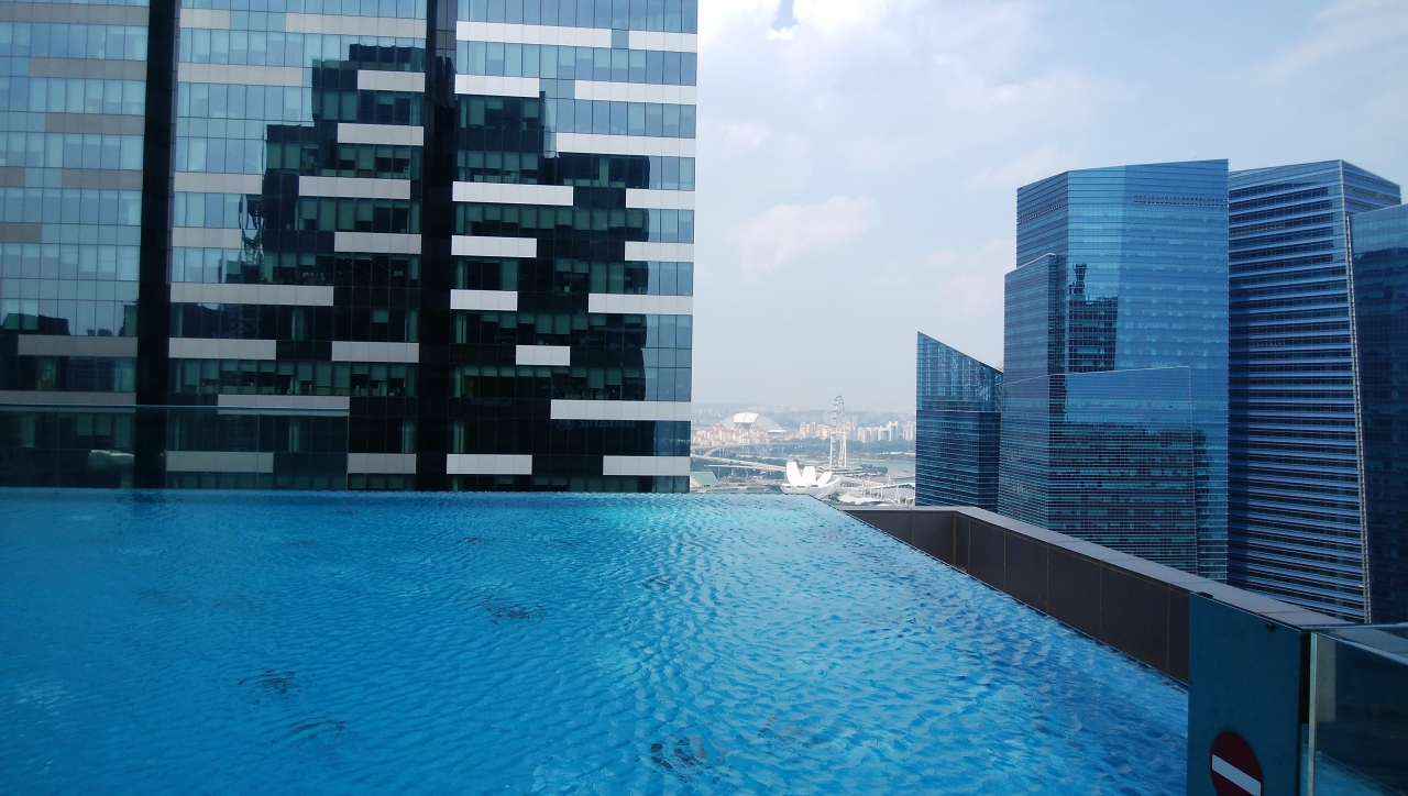 ダウンタウン駅から徒歩5分の立地。まわりには高層のオフィスビルがあります。ビルに囲まれていますが、海も見え、セントーサ島も見え、眺望は思ったより良いです。