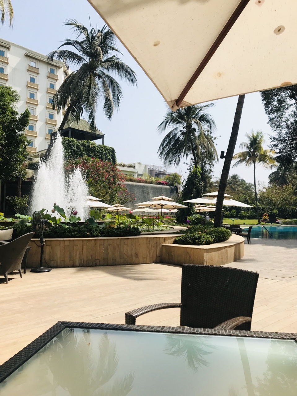 素晴らしかった。正直良すぎて出かけたくなくなった。ロビーの少し下がった所から外に出て、プールと噴水が見える日陰のテーブル(パラソルと扇風機有り)に座ってダラダラするのが最高。