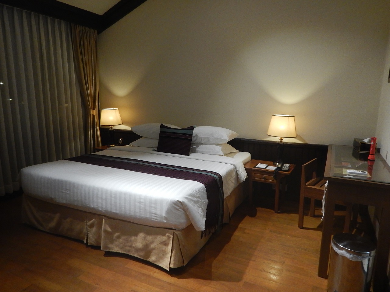 デラックス リバービューに2泊しました。チェックインが夜だったのですが、部屋がエーヤワディー川から遠かったので、レセプションで部屋が予約通りか確認しましたが、問題無いとのことでした。翌朝、部屋のテラスから眺望を確認したところ、川は見えますが、デラックスどうかは微妙な感じでした。川が少し見えるかどうかの違いであれば、デラックスガーデンビューがコスパが良いと思います。お風呂については、熱いお湯が出ますし、水圧も十分なのですが、バスタブが少し浅いと感じました。朝食は、いたって普通です。ただ、卵料理のライブキッチンは期待しないほうがいいかもしれません。バーは夜21時過ぎに利用しましたが、21時30分を過ぎると、何の案内もなくスタッフがいなくなりました。21時30分からはウイスキーとブランデーが20%OFFなのですが、サービスのグレードが下がっているので、お得かどうかは微妙です。会計はレストランで行いました。事前に説明があれば戸惑わないので、メニューなどに注意書きがあればよいと思いました。こちらのバーは、夕方にハッピータイムが設定されています。