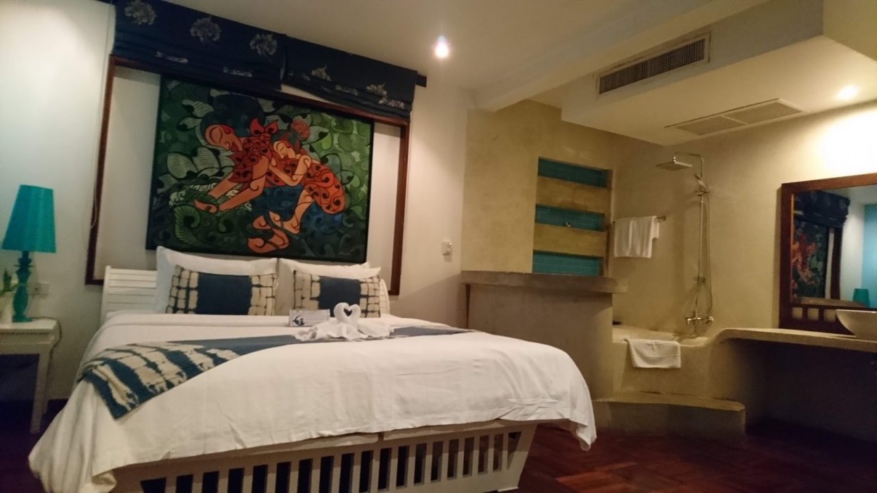 目の前がナイトマーケット、隣がレンタサイクル・現地ツアーデスクでパークー洞窟への船のチケット手配などができて、大変便利な立地です。
