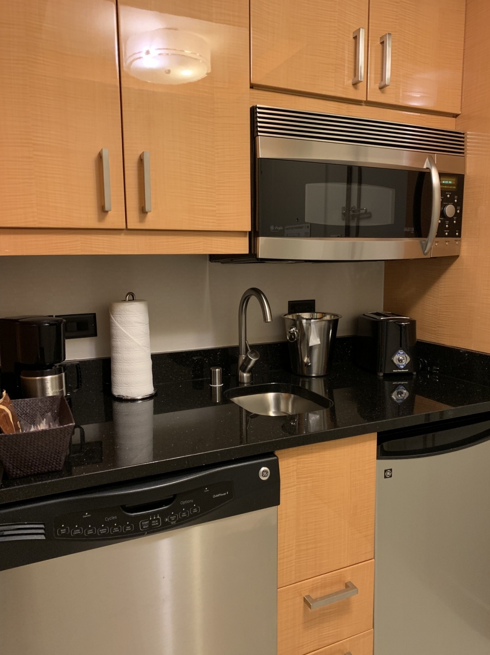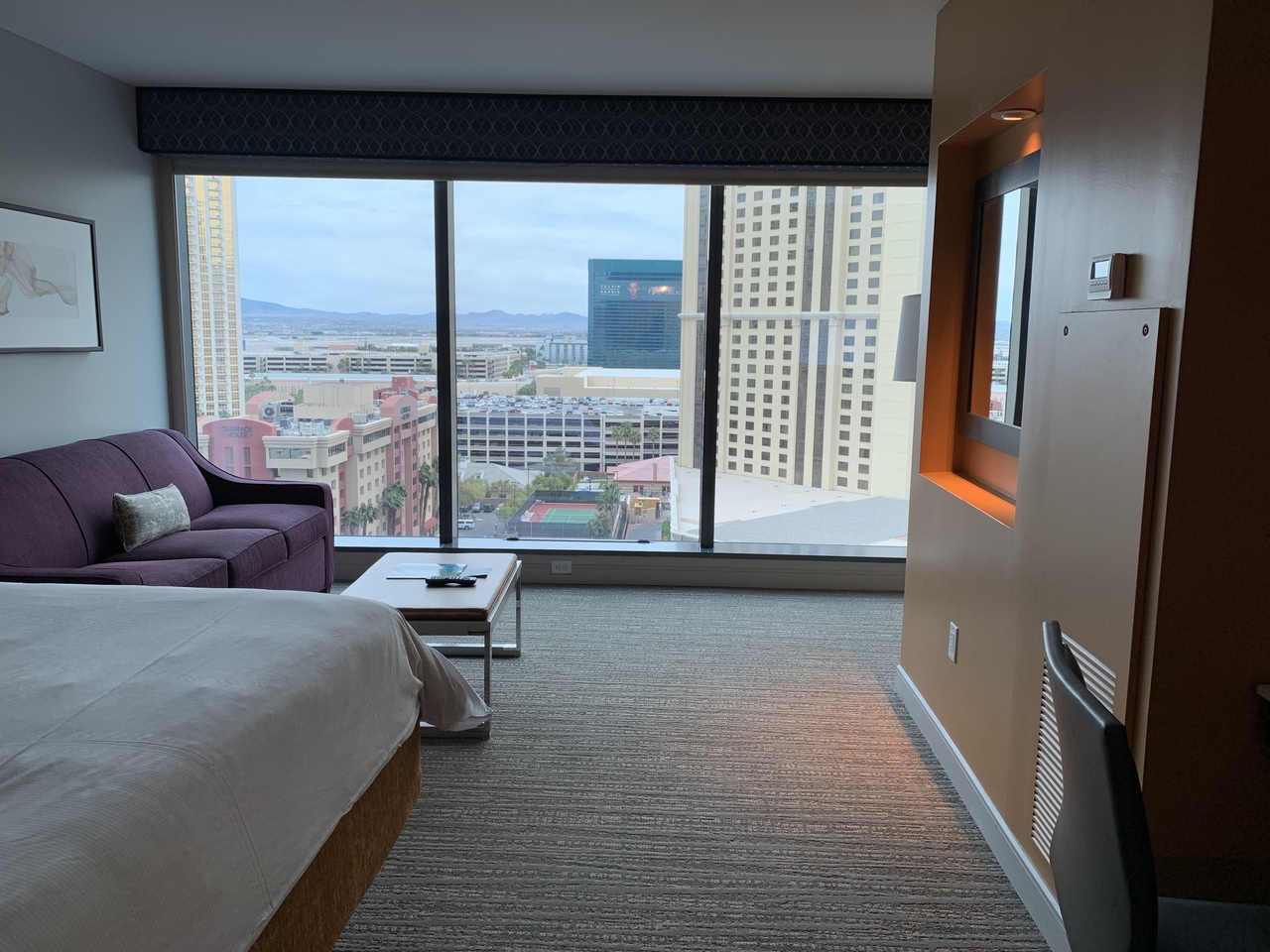 ラスベガスストリップ大通りとミラクルマイルズ経由で繋がっているので、食事にも観光にも便利な立地です。青いガラス張りの外観も、フロント周りもセンス良くスタイリッシュです。エレベーターホールに行くには、ルームキーでのセキュリティチェックがあり安心感があります。ツインの部屋はないのですが、ソファーベッドがあるので自分でベッドメイクすればOKです。シーツや毛布は余分に備わっていました。各部屋にジェットバスが付いているのもプラスポイントです。一つ難を言うと、ヒルトンアプリからデジタルチェックインできないので、部屋を事前に決めることができません。ヒルトンバケーションズなためでしょうか。チェックアウトは10時と早いですが、ヒルトン会員はレイトチェックアウト出来るので問題ないと思います。