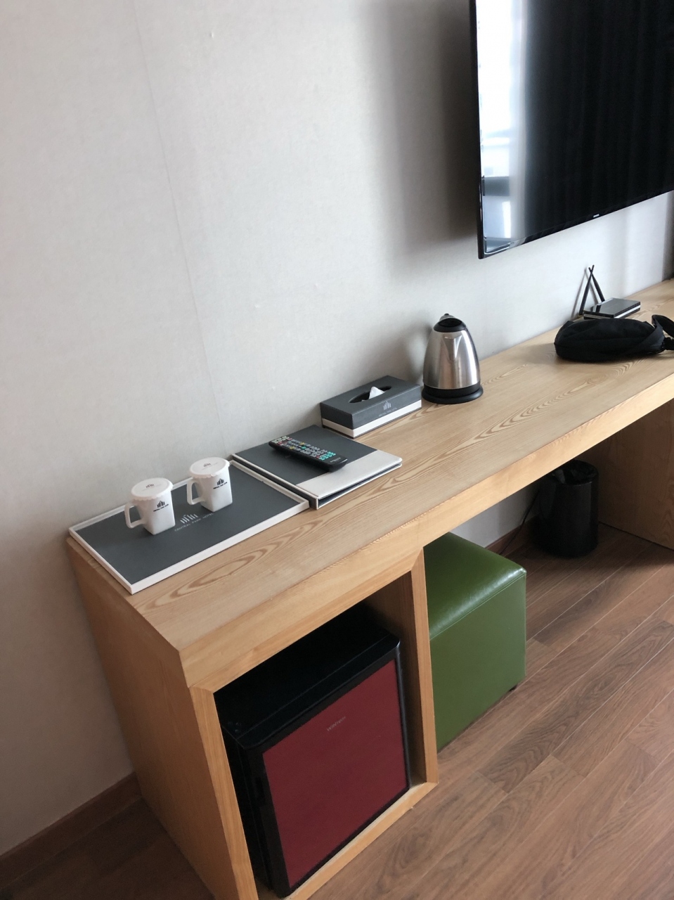 ツインの部屋は簡素ですが広さはあり、大きな壁掛けテレビ、机、湯沸かし、冷蔵庫もあります。ベッドも硬め清潔で寝心地も良かったです。また、大きな窓で明るかったのですが周りが雑居ビルなので景色は悪いですが立地を思えば当然です。