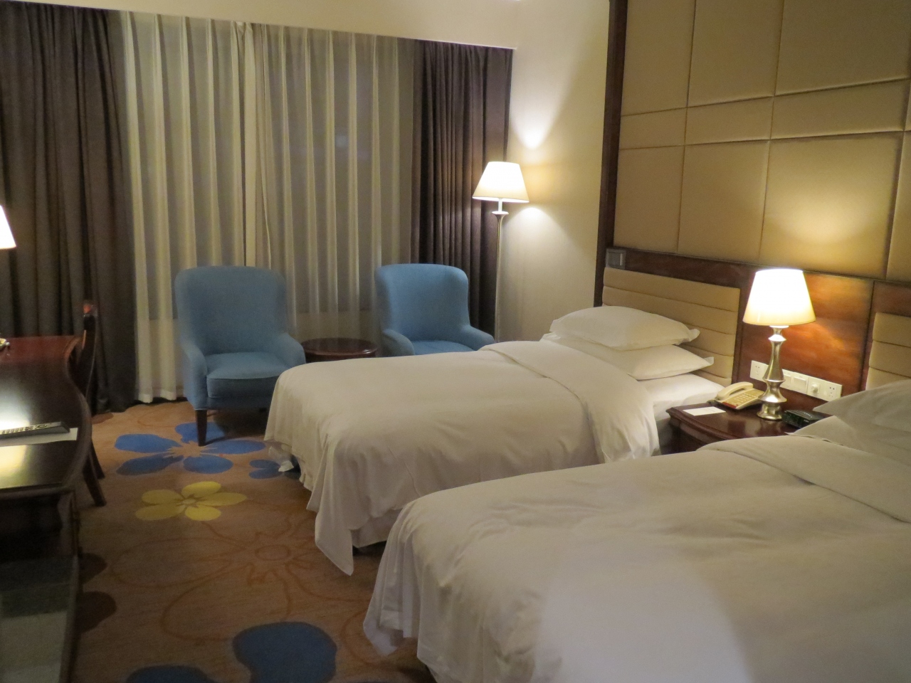 桂林の中でしたら、高級なホテルと言えるでしょう。ロビーはとても広くて、吹き抜けになっています。豪華さはロビーに感じられます。一人で泊まった部屋にはセミダブルベッドが二つあります。ペットボトルが二本のサービス。スーツケースを置く台の横には、あまり使い道がないスーツ掛け。欧州のホテルでも見かけたことがない家具。惜しいのはバスタブ。底に錆びがこびり付いていました。どうやらホーロー部分が一部剥がれて錆が出た感じ。ロビーにお金をかけるよりは、個々の部屋の備品にもっとお金をかけたほうがいいです。どちらかというと、もっと歴史の深い中国伝統様式の家具をそろえたほうがいいかも。立地は確かにいいです。両江四湖景区の中にあり、日塔と月塔が建ち並ぶ日月双塔文化公園、裏側にはショッピング街もあり便利がいいです。朝食会場はロビーの二階、開放的な感じがします。ブッフェ式のメニューの種類はかなり多いほうです。お好みに応じてラーメンも作ってもらえます。こだわりがある料理はあまりなかったですが、味のほうは合格点です。世界の著名人もこのホテルに宿泊した時の写真が通路に展示されています。歌手であり版画家でもあるジュディ・オングさんの写真があったのにはビックリ!