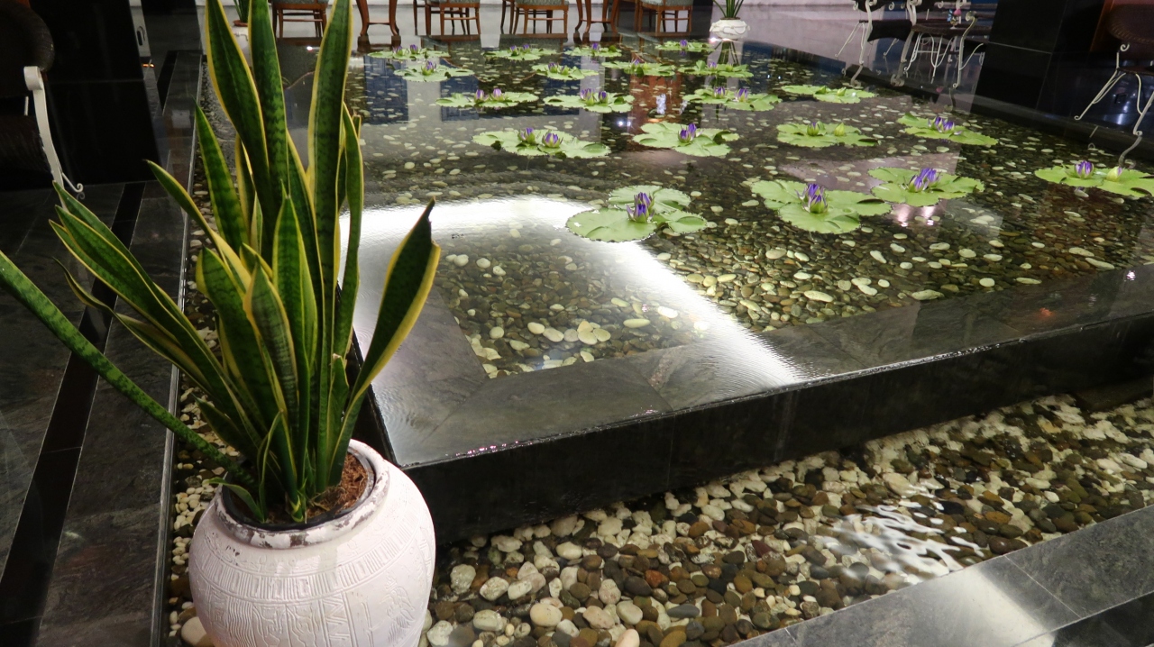 フロント前の室内の水周りの池の感じが涼し気でいい感じです。