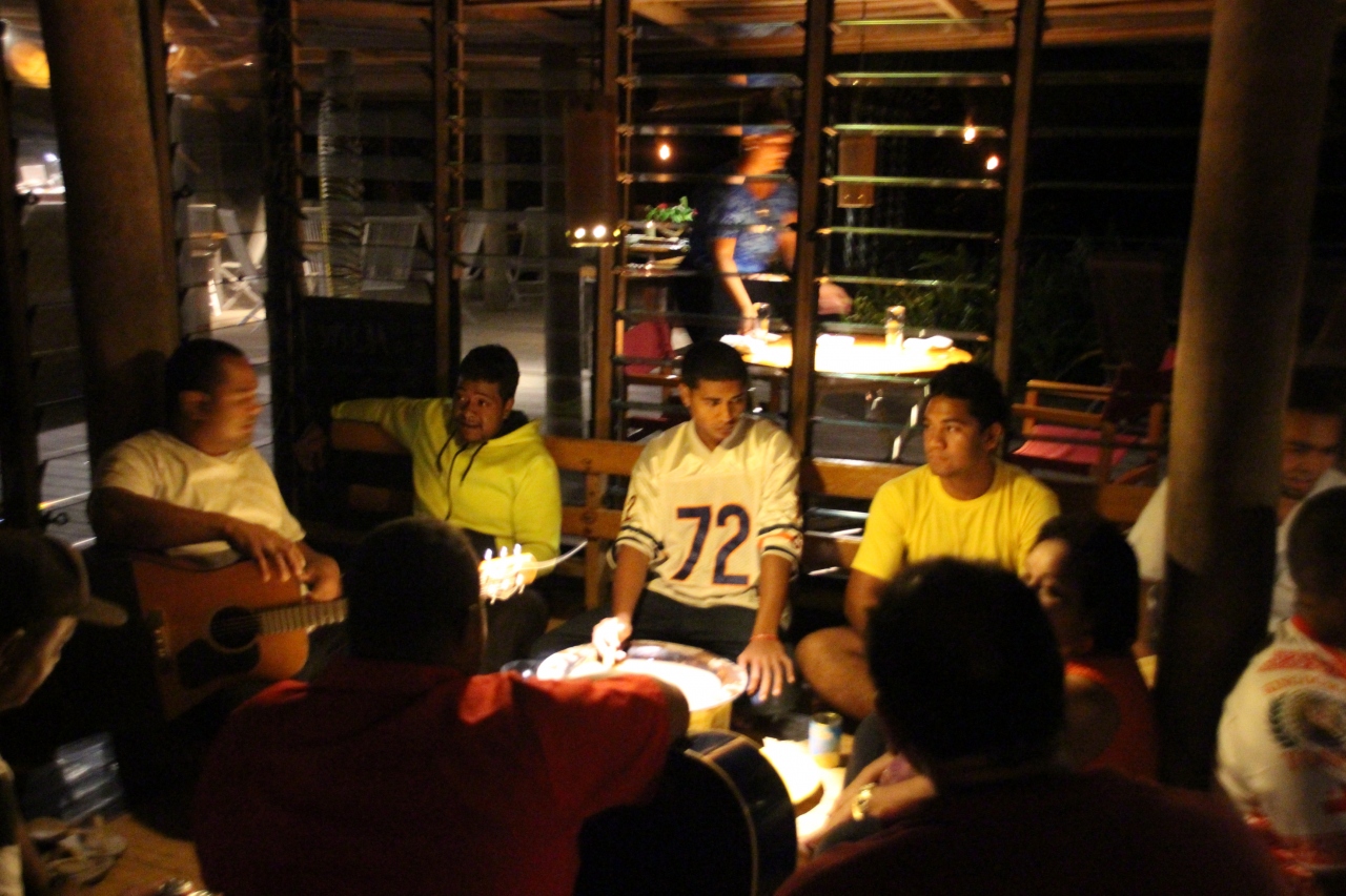1週間に一度、ポリネシアン・ナイトと称して、トンガ伝統の歌と踊りの夕べがあります。特別のショー・チームではなく、キッチンなどの従業員の皆さんが出演します。なお、この夜のレストランはBBQのみとなります。踊りは30分くらいですが、歌はその前の食事時間からずっと続けられます。トンガにはチップの習慣はありませんが、踊り手さんには2トンガドル札(約100円くらい)程度をチップとして体に貼付けます。(レセプションで両替してくれますから事前の用意は必要ありません)