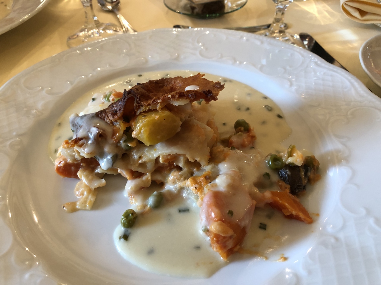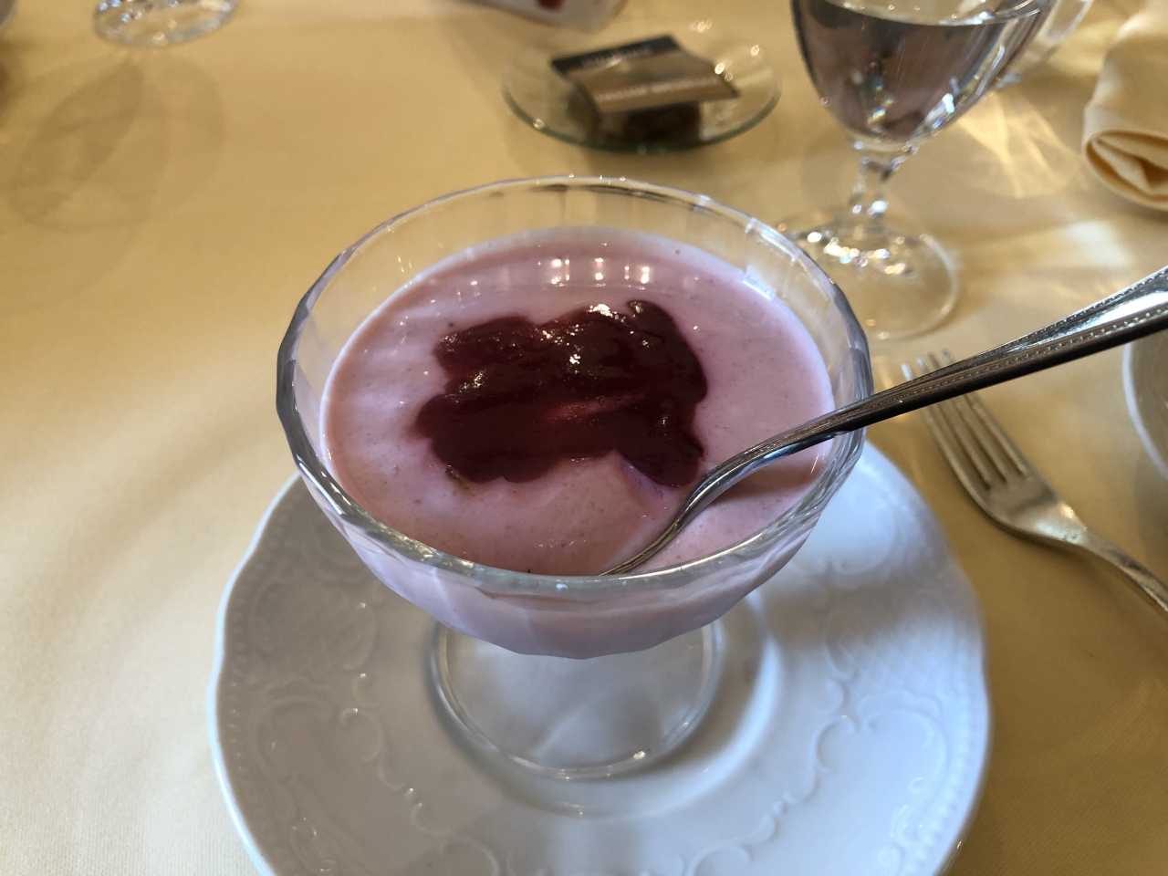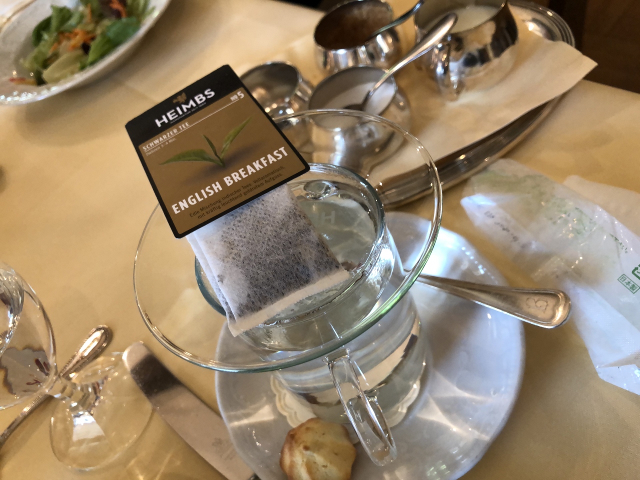 ツアーでディナー利用しました。ホーエンツオレルン城のすぐ下にあります。この前から、山の上に建つお城の写真を撮ることができます。メニューはサラダ、野菜入りラザニア、ベリーヨーグルト。味は普通。紅茶は2.5ユーロ。一口クッキーと、お砂糖が3種類ついて来ました。