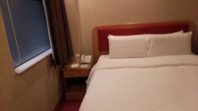 部屋はダブルベッドが1台でペットボトルの無料の水が1本 歯ブラシ スリッパ 電気ポット 変換プラグがありました