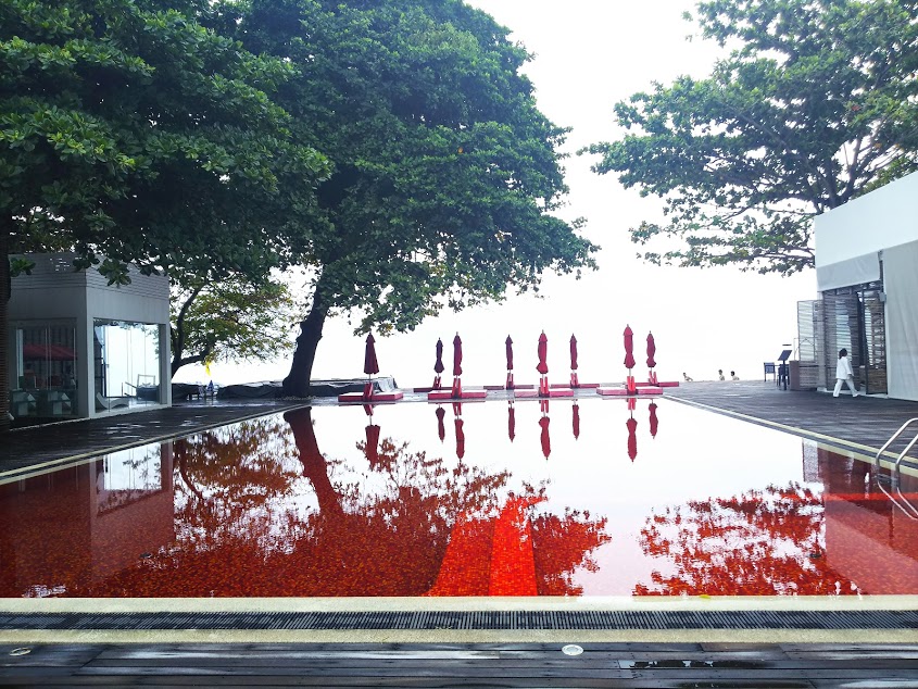 とても開放的でおしゃれです。赤いプールと海を眺めながら食事ができます。