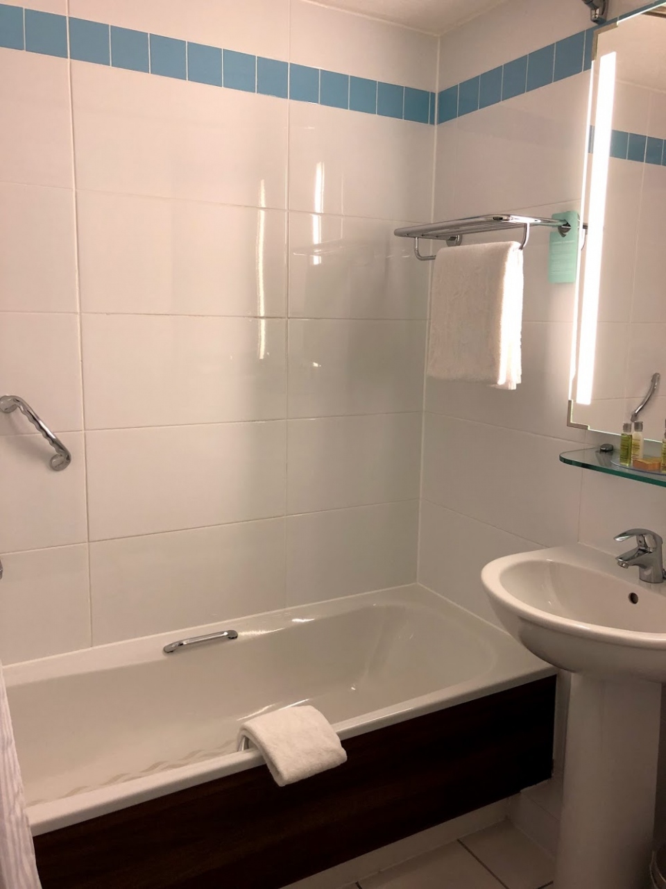 羽田空港から夕方ヒースロー国際空港に到着。その後レンタカー会社のシャトルバスで移動後レンタカーをピックアップし、近くの「Hilton Garden Inn London Heathrow Airport」にチェックイン。次の日からの移動に合わせロンドン市内に移動する事無しで、ホテルのバーでビール、カラマリフライ、ピザの夕食。部屋はバスルーム浴槽付きでその後のホテル、B&Bでの宿泊に無いゆったりバスタイムとなりました。