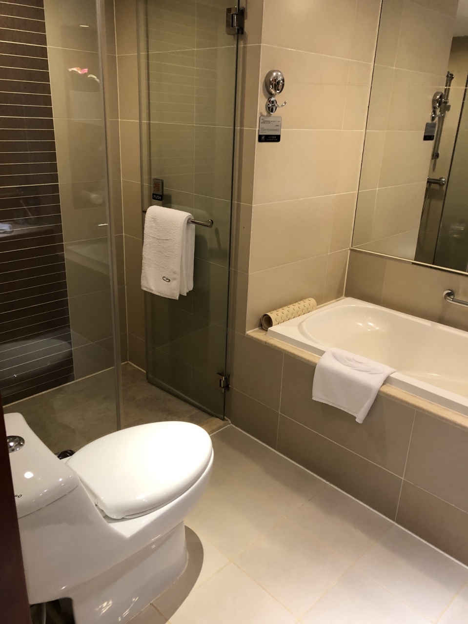 西安観光ツアーで3連泊しましたが、城壁内の中心に位置しており立地条件良いホテルです。中国系の5星ホテルには余り期待してませんでしが、客室は清潔感があり特にタオルは全て新しい物でバスタブは狭いですが、シャワールームも有り問題有りません。朝食は中華中心!で刀削麺、肉まんは美味しです!難問は言葉だけでした!
