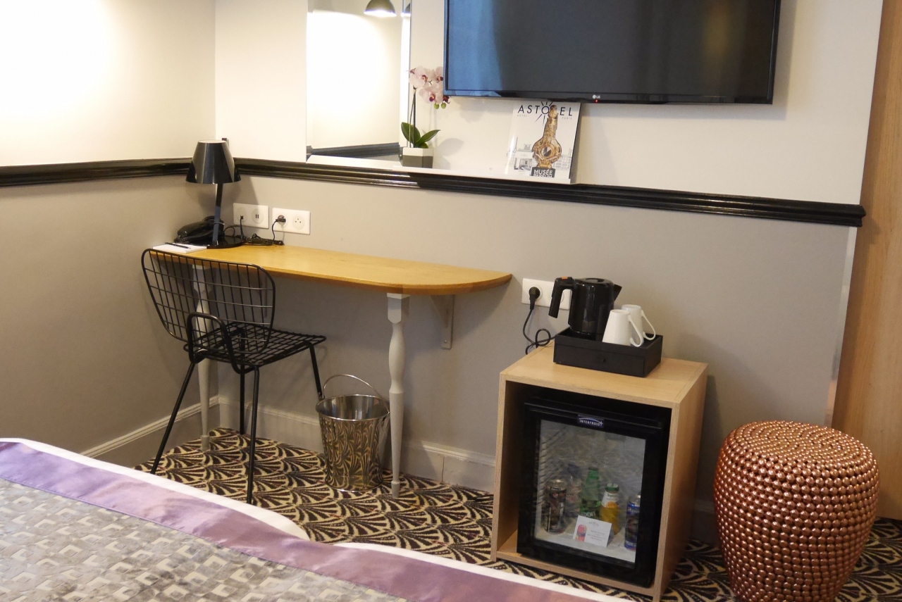 お部屋はコンパクトですがおしゃれで清潔、冷蔵庫にはフリーの飲み物、ただバスルームは湯圧が低く、仕切りが小さいので床が水浸しになるのだけが難点でした。