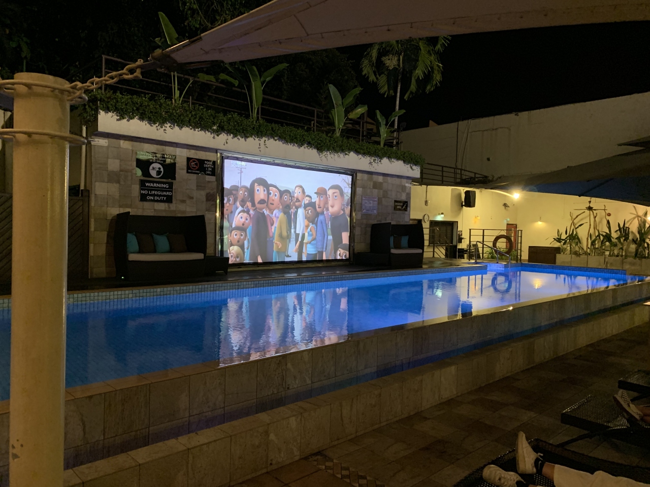 フロントの近くには無料のクッキーが置いてあります。またプールでは夜にはプロジェクターでアニメ映画を上映していました。