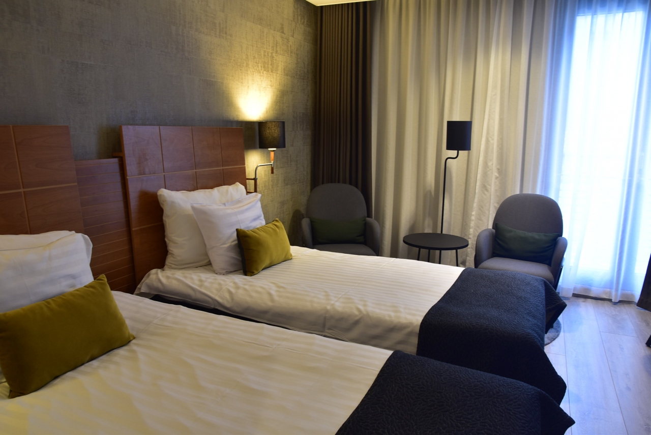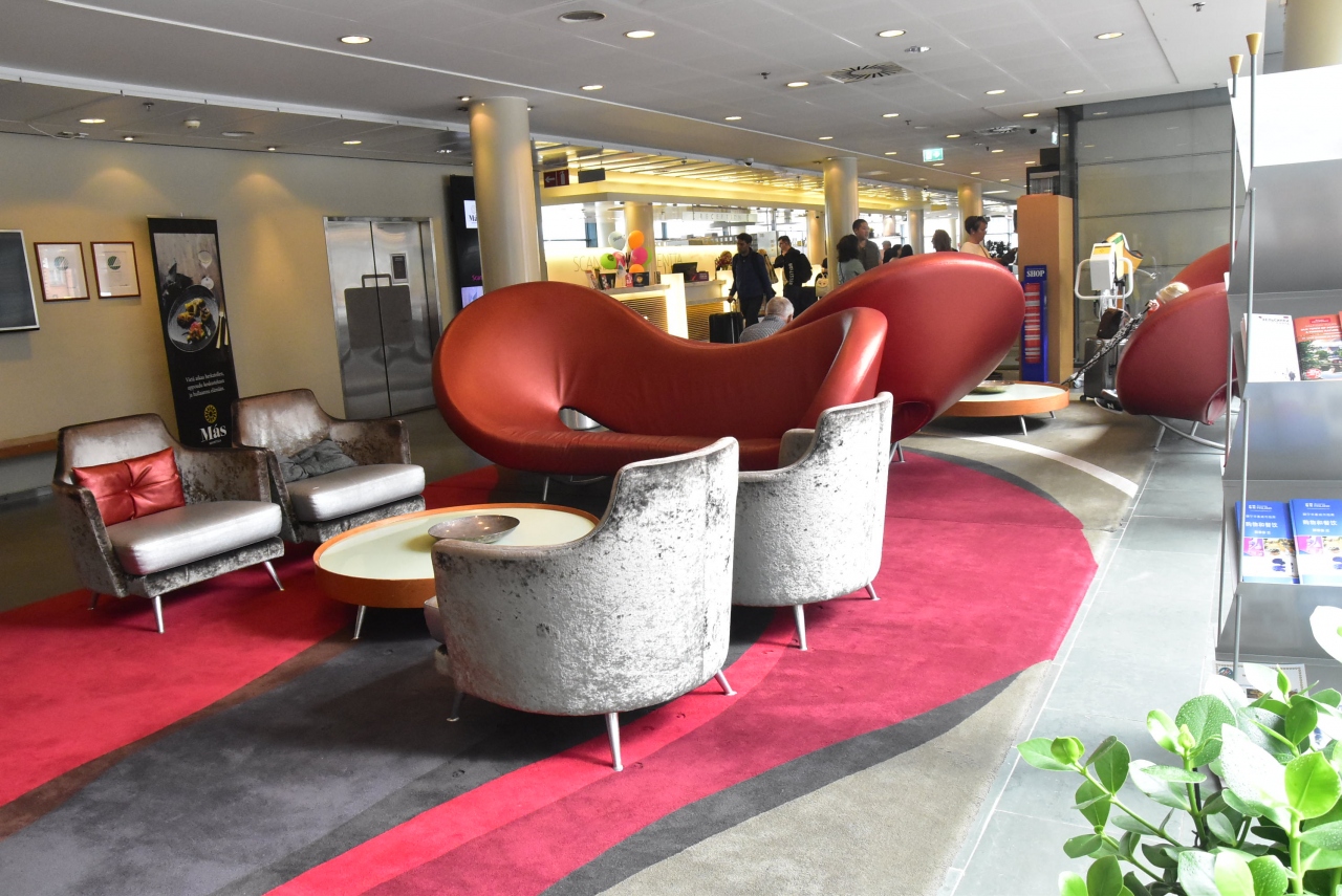 ”コ”の字型の大きなホテルで、インテリアに北欧らしさを感じます。