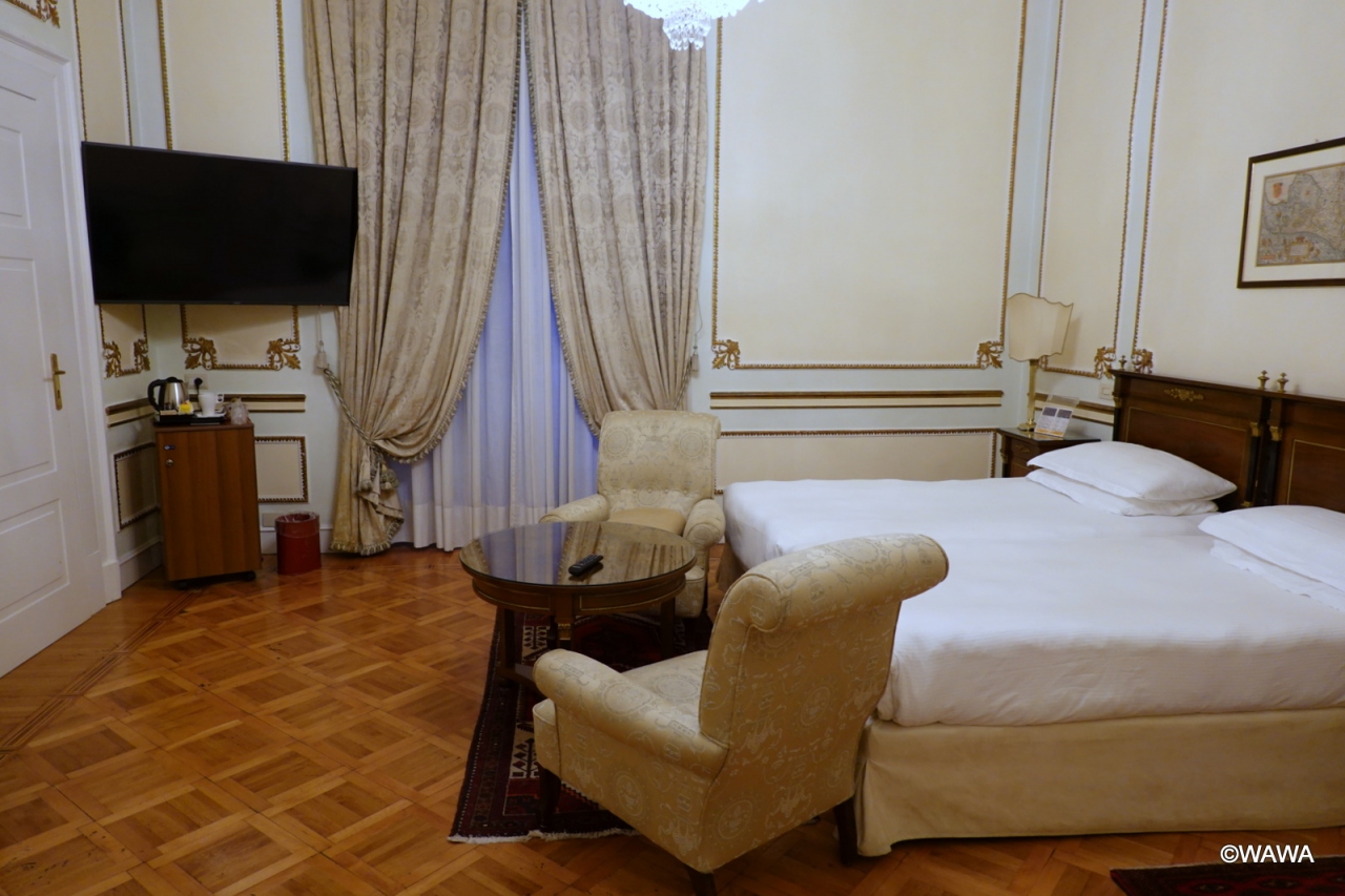 ローマの4つ星ホテル「キリナーレ ホテル(ホテル クイリナーレ)」には夫婦で8連泊して市内中心に町歩きを楽しみました。当初、昨年来のパリやニューヨーク旅行で家族の評判が良かったサービス付アパートホテル(フロント付)を探しましたが、ローマ市内では似たシステムの宿が見当たらず、キッチンや電子レンジ付きはあきらめ冷蔵庫や電気ポットを完備しているホテルに絞って探し、先達の方々のポジティブな口コミなども参考にしてココに決めました。(電子レンジはおろか、冷蔵庫や電気ポットですら完備しているホテルはローマ中心部では少なかったです。。)