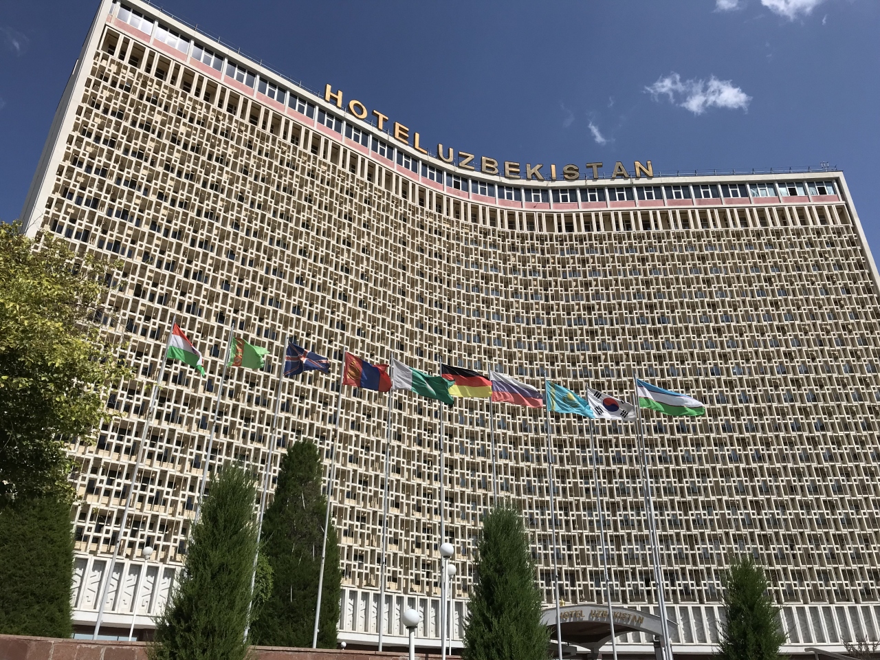 旅行に行く前から非常に興味をそそられてタシュケントのホテルウズベキスタン。ティムールの像から地下通路で結ばれています。ホテルでお茶をしようと立ち寄りました。外観はやはり迫力があり、雰囲気があっていい感じです。