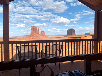 モニュメントバレーが一望できるロッジ。大きな窓からモニュメントバレーが見れ、またベランダにも椅子があるため、景色を眺められる。Wi-Fiも使え、レンジも完備している。2段ベットの寝心地が少し悪いが、朝日や夕日が一望できるロッジは格別だ。